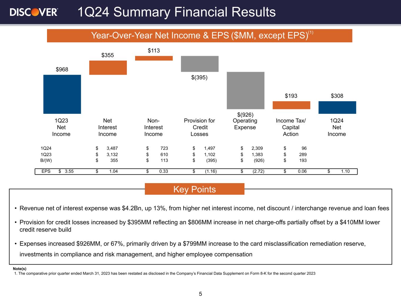 1Q24 Highlights 4 • 1Q24 net income of $308MM; diluted EPS of $1.10; and return on equity of 8% • Core financial performance remains strong ◦ Double digit revenue expansion YOY reflecting resilient loan growth and net interest margin trends ◦ Strong consumer deposit growth ◦ Credit metrics consistent with our outlook; delinquency formation improving • Continued to progress key initiatives ◦ Advanced compliance and risk management capabilities ◦ Increased the card misclassification remediation reserve to accelerate resolution ◦ Remained on track to execute a sale of the student loan portfolio in the second half of the year • Entered a definitive agreement to merge with Capital One ◦ Strategic logic, operating scale and combined economics are compelling ◦ Combines two organizations with similar commitments to provide a leading customer experience ◦ Enables the Discover network to be more competitive Note(s) Merger with Capital One remains subject to numerous conditions including shareholder and regulatory approval
