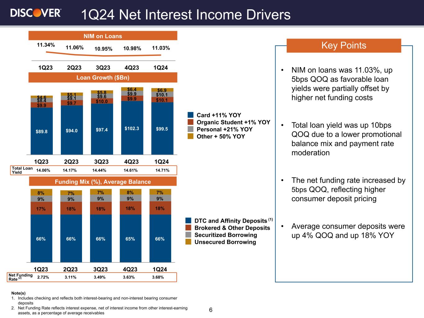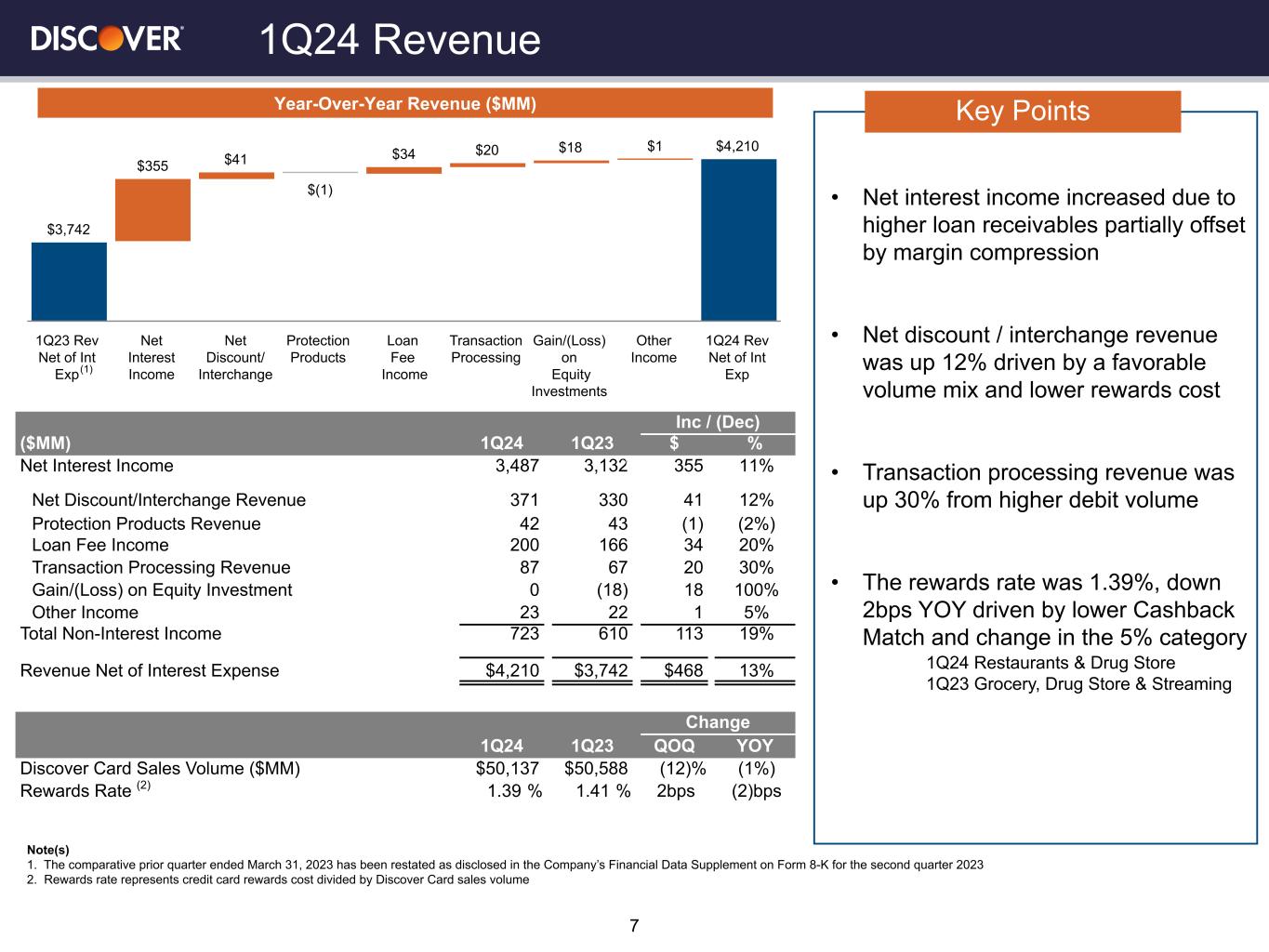 • NIM on loans was 11.03%, up 5bps QOQ as favorable loan yields were partially offset by higher net funding costs • Total loan yield was up 10bps QOQ due to a lower promotional balance mix and payment rate moderation • The net funding rate increased by 5bps QOQ, reflecting higher consumer deposit pricing • Average consumer deposits were up 4% QOQ and up 18% YOY 1Q24 Net Interest Income Drivers 6 Key Points Note(s) 1. Includes checking and reflects both interest-bearing and non-interest bearing consumer deposits 2. Net Funding Rate reflects interest expense, net of interest income from other interest-earning assets, as a percentage of average receivables 11.34% 11.06% 10.95% 10.98% 11.03% 1Q23 2Q23 3Q23 4Q23 1Q24 NIM on Loans Loan Growth ($Bn) Funding Mix (%), Average Balance $89.8 $94.0 $97.4 $102.3 $99.5 $9.9 $9.7 $10.0 $9.9 $10.1$8.4 $9.1 $9.6 $9.9 $10.1$4.6 $5.1 $5.8 $6.4 $6.9 Card +11% YOY Organic Student +1% YOY Personal +21% YOY Other + 50% YOY 1Q23 2Q23 3Q23 4Q23 1Q24 66% 66% 66% 65% 66% 17% 18% 18% 18% 18% 9% 9% 9% 9% 9% 8% 7% 7% 8% 7% DTC and Affinity Deposits Brokered & Other Deposits Securitized Borrowing Unsecured Borrowing 1Q23 2Q23 3Q23 4Q23 1Q24 Total Loan Yield 14.06% 14.17% 14.44% 14.61% 14.71% Net Funding Rate (2) 2.72% 3.11% 3.49% 3.63% 3.68% (1)