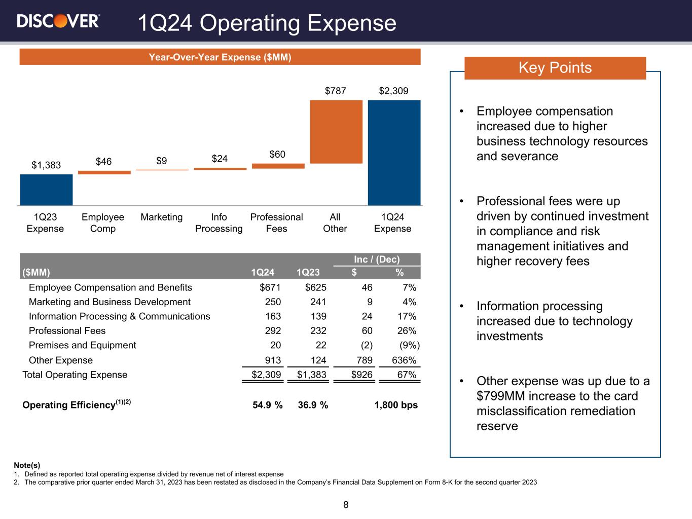 Note(s) 1. The comparative prior quarter ended March 31, 2023 has been restated as disclosed in the Company’s Financial Data Supplement on Form 8-K for the second quarter 2023 2. Rewards rate represents credit card rewards cost divided by Discover Card sales volume • Net interest income increased due to higher loan receivables partially offset by margin compression • Net discount / interchange revenue was up 12% driven by a favorable volume mix and lower rewards cost • Transaction processing revenue was up 30% from higher debit volume • The rewards rate was 1.39%, down 2bps YOY driven by lower Cashback Match and change in the 5% category 1Q24 Restaurants & Drug Store 1Q23 Grocery, Drug Store & Streaming 1Q24 Revenue 7 Key Points Inc / (Dec) ($MM) 1Q24 1Q23 $ % Net Interest Income 3,487 3,132 355 11% Net Discount/Interchange Revenue 371 330 41 12% Protection Products Revenue 42 43 (1) (2%) Loan Fee Income 200 166 34 20% Transaction Processing Revenue 87 67 20 30% Gain/(Loss) on Equity Investment 0 (18) 18 100% Other Income 23 22 1 5% Total Non-Interest Income 723 610 113 19% Revenue Net of Interest Expense $4,210 $3,742 $468 13% Change 1Q24 1Q23 QOQ YOY Discover Card Sales Volume ($MM) $50,137 $50,588 (12) % (1%) Rewards Rate (2) 1.39 % 1.41 % 2bps (2)bps $3,742 $355 $41 $(1) $34 $20 $18 $1 $4,210 1Q23 Rev Net of Int Exp Net Interest Income Net Discount/ Interchange Protection Products Loan Fee Income Transaction Processing Gain/(Loss) on Equity Investments Other Income 1Q24 Rev Net of Int Exp Year-Over-Year Revenue ($MM) (1) (1)