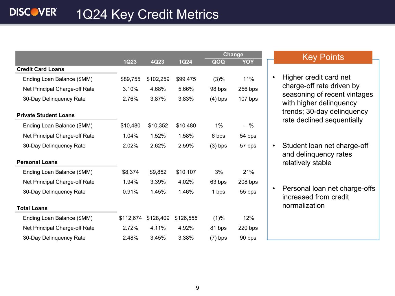 Total loans ended the quarter at $126.6 billion, up 12% year-over-year, and down 1% sequentially. Credit card loans ended the quarter at $99.5 billion, up 11% year-over-year. Personal loans increased $1.7 billion, or 21%, and private student loans were flat. The organic student loan portfolio, which excludes purchased loans, increased $123 million, or 1% year-over-year.