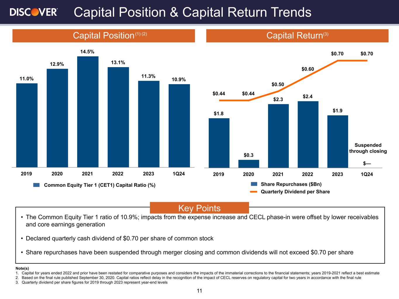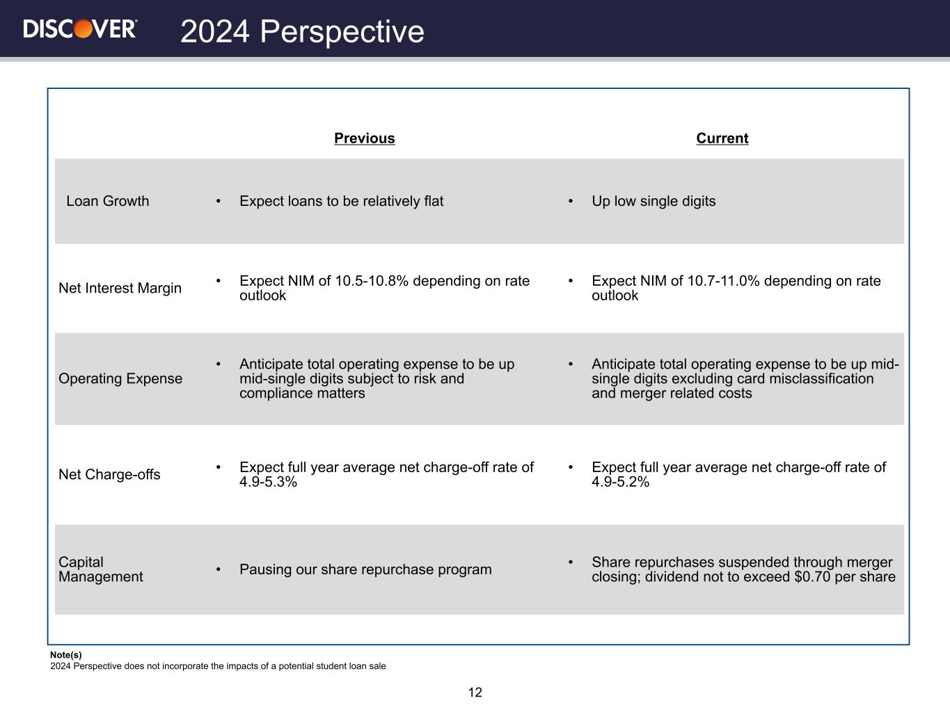 12 2024 Perspective Previous Current Loan Growth • Expect loans to be relatively flat • Up low single digits Net Interest Margin • Expect NIM of 10.5-10.8% depending on rate outlook • Expect NIM of 10.7-11.0% depending on rate outlook Operating Expense • Anticipate total operating expense to be up mid-single digits subject to risk and compliance matters • Anticipate total operating expense to be up mid- single digits excluding card misclassification and merger related costs Net Charge-offs • Expect full year average net charge-off rate of 4.9-5.3% • Expect full year average net charge-off rate of 4.9-5.2% Capital Management • Pausing our share repurchase program • Share repurchases suspended through merger closing; dividend not to exceed $0.70 per share Note(s) 2024 Perspective does not incorporate the impacts of a potential student loan sale