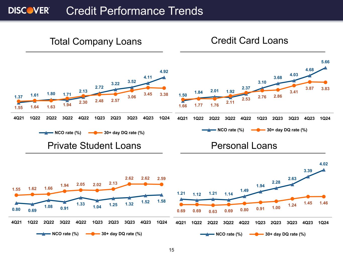 The total net charge-off rate of 4.92% was 220 basis points higher versus the prior year period reflecting continued seasoning of recent vintages with higher delinquency trends. The credit card net charge-off rate was 5.66%, up 256 basis points from the prior year period and up 98 basis points from the prior quarter. The 30+ day delinquency rate for credit card loans was 3.83%, up 107 basis points year-over-year and down 4 basis points from the prior quarter. The student loan net charge-off rate was 1.58%, up 54 basis points from the prior year and up 6 basis points from the prior quarter. Personal loans net charge-off rate of 4.02% was up 208 basis points from the prior year and up 63 basis points from the prior quarter.
