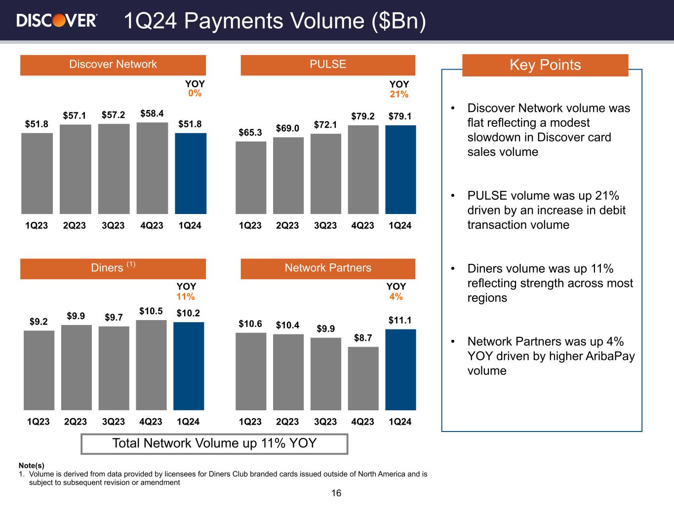 Payment Services volume was $100.3 billion, up 18% from the prior year period. PULSE dollar volume was up 21% primarily driven by increased debit transaction volume. Diners Club volume was up 11% year-over-year reflecting continued strength across most regions. Network Partners volume increased 4% from the prior year primarily reflecting higher AribaPay volume.