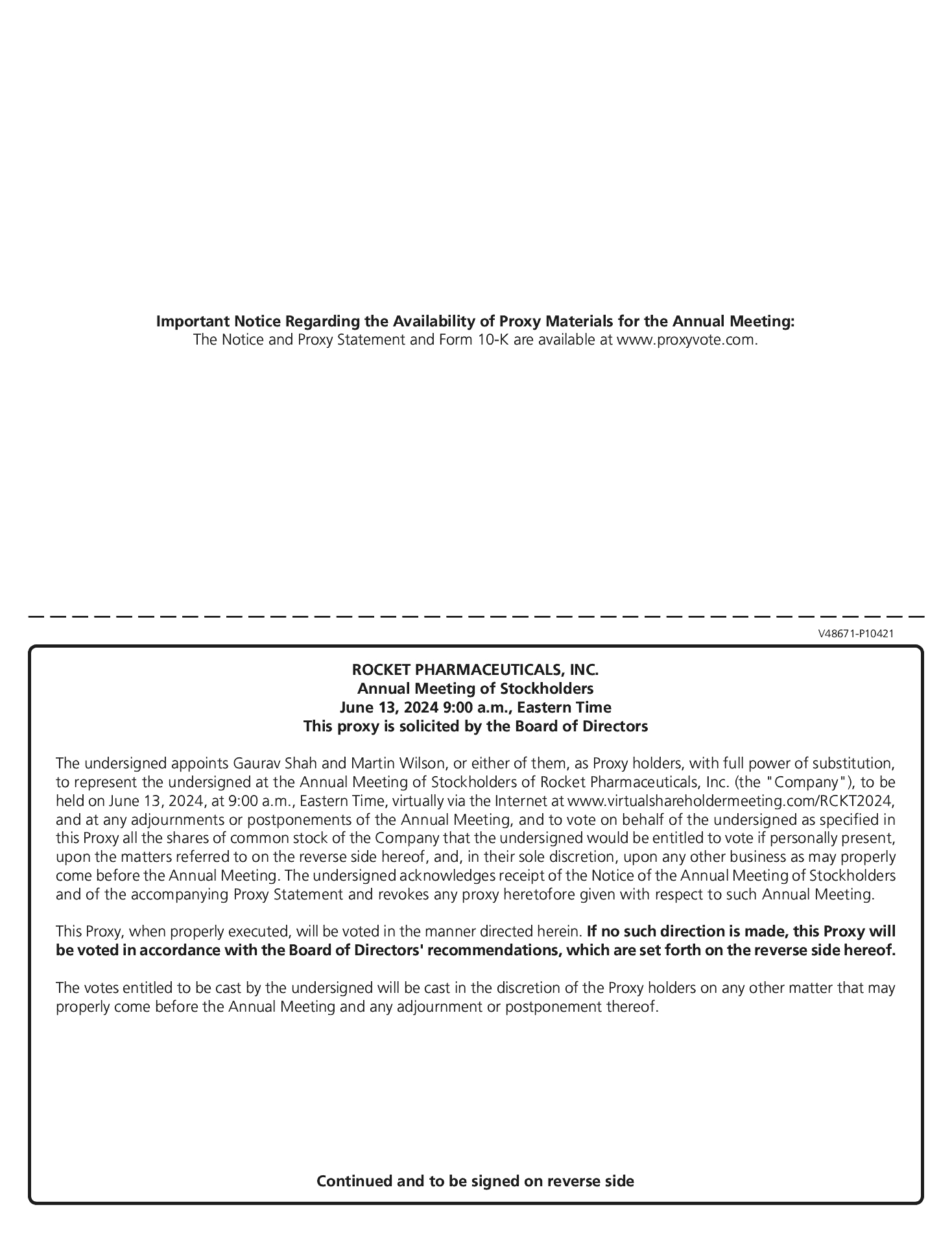 • | To attend the Annual Meeting virtually via the Internet, log in at www.virtualshareholdermeeting.com/RCKT2024. You will need the 16-digit control number included on your Notice of Internet Availability or proxy card (if you received a paper delivery of proxy materials) to enter the Annual Meeting via the Internet. Instructions on how to attend and participate virtually via the Internet, including how to demonstrate proof of share ownership, are posted at www.virtualshareholdermeeting.com/RCKT2024. |