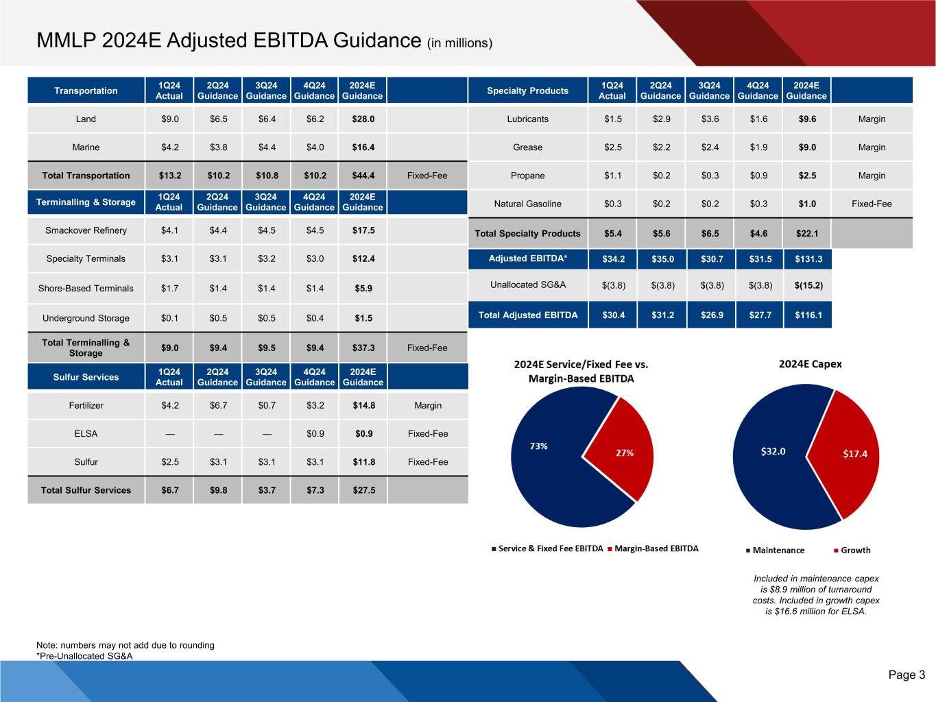 MMLP 1Q 2024 Adjusted EBITDA Reconciliation & Comparison to Guidance (in millions) Page 2 Terminalling & Storage 2024E Guidance 1Q24 Guidance 1Q24 Actual Smackover Refinery $17.5 $4.7 $4.1 Specialty Terminals $12.4 $3.0 $3.1 Shore-Based Terminals $5.9 $1.4 $1.7 Underground Storage $1.5 $0.3 $0.1 Total Terminalling & Storage $37.3 $9.4 $9.0 Specialty Products 2024E Guidance 1Q24 Guidance 1Q24 Actual Lubricants $9.6 $2.2 $1.5 Grease $9.0 $2.5 $2.5 Propane $2.5 $1.0 $1.1 Natural Gasoline $1.0 $0.2 $0.3 Total Specialty Products $22.1 $6.0 $5.4 Adjusted EBITDA* $131.3 $35.4 $34.2 Unallocated SG&A $(15.2) $(3.8) $(3.8) Total Adjusted EBITDA $116.1 $31.6 $30.4 Sulfur Services 2024E Guidance 1Q24 Guidance 1Q24 Actual Fertilizer $14.8 $6.6 $4.2 ELSA $0.9 — — Sulfur $11.8 $3.2 $2.5 Total Sulfur Services $27.5 $9.8 $6.7 Transportation 2024E Guidance 1Q24 Guidance 1Q24 Actual Land $28.0 $7.1 $9.0 Marine $16.4 $3.1 $4.2 Total Transportation $44.4 $10.2 $13.2 Note: numbers may not add due to rounding *Pre-Unallocated SG&A Transportation Terminalling & Storage Sulfur Services Specialty Products SG&A Interest Expense 1Q24 Actual Net income (loss) $9.8 $3.7 $3.7 $4.5 $(4.6) $(13.8) $3.3 Interest expense add back — — — — — $13.8 $13.8 Income tax expense — — — — $0.8 — $0.8 Operating Income (loss) $9.8 $3.7 $3.7 $4.5 $(3.8) $0.0 $17.9 Depreciation and amortization $3.5 $5.4 $3.0 $0.8 — — $12.6 Gain on sale of property, plant, and equipment $(0.1) $(0.1) — — — — $(0.2) Unit-based compensation — — — — $0.1 — $0.1 Adjusted EBITDA $13.2 $9.0 $6.7 $5.4 $(3.8) $0.0 $30.4