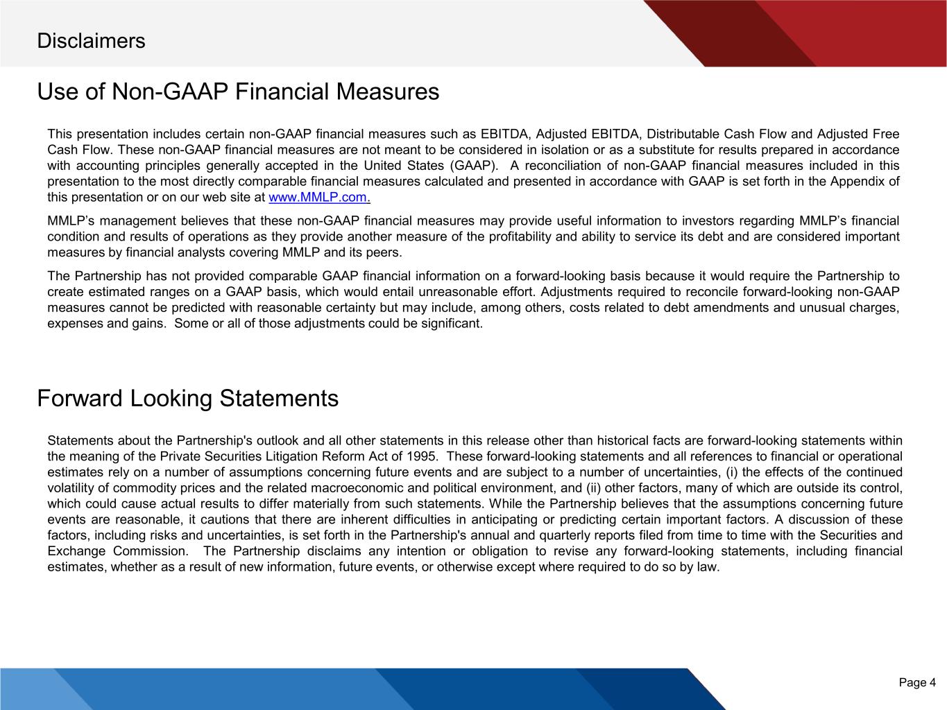 Page 4 Use of Non-GAAP Financial Measures Forward Looking Statements This presentation includes certain non-GAAP financial measures such as EBITDA, Adjusted EBITDA, Distributable Cash Flow and Adjusted Free Cash Flow. These non-GAAP financial measures are not meant to be considered in isolation or as a substitute for results prepared in accordance with accounting principles generally accepted in the United States (GAAP). A reconciliation of non-GAAP financial measures included in this presentation to the most directly comparable financial measures calculated and presented in accordance with GAAP is set forth in the Appendix of this presentation or on our web site at www.MMLP.com. MMLP’s management believes that these non-GAAP financial measures may provide useful information to investors regarding MMLP’s financial condition and results of operations as they provide another measure of the profitability and ability to service its debt and are considered important measures by financial analysts covering MMLP and its peers. The Partnership has not provided comparable GAAP financial information on a forward-looking basis because it would require the Partnership to create estimated ranges on a GAAP basis, which would entail unreasonable effort. Adjustments required to reconcile forward-looking non-GAAP measures cannot be predicted with reasonable certainty but may include, among others, costs related to debt amendments and unusual charges, expenses and gains. Some or all of those adjustments could be significant. Statements about the Partnership's outlook and all other statements in this release other than historical facts are forward-looking statements within the meaning of the Private Securities Litigation Reform Act of 1995. These forward-looking statements and all references to financial or operational estimates rely on a number of assumptions concerning future events and are subject to a number of uncertainties, (i) the effects of the continued volatility of commodity prices and the related macroeconomic and political environment, and (ii) other factors, many of which are outside its control, which could cause actual results to differ materially from such statements. While the Partnership believes that the assumptions concerning future events are reasonable, it cautions that there are inherent difficulties in anticipating or predicting certain important factors. A discussion of these factors, including risks and uncertainties, is set forth in the Partnership's annual and quarterly reports filed from time to time with the Securities and Exchange Commission. The Partnership disclaims any intention or obligation to revise any forward-looking statements, including financial estimates, whether as a result of new information, future events, or otherwise except where required to do so by law. Disclaimers