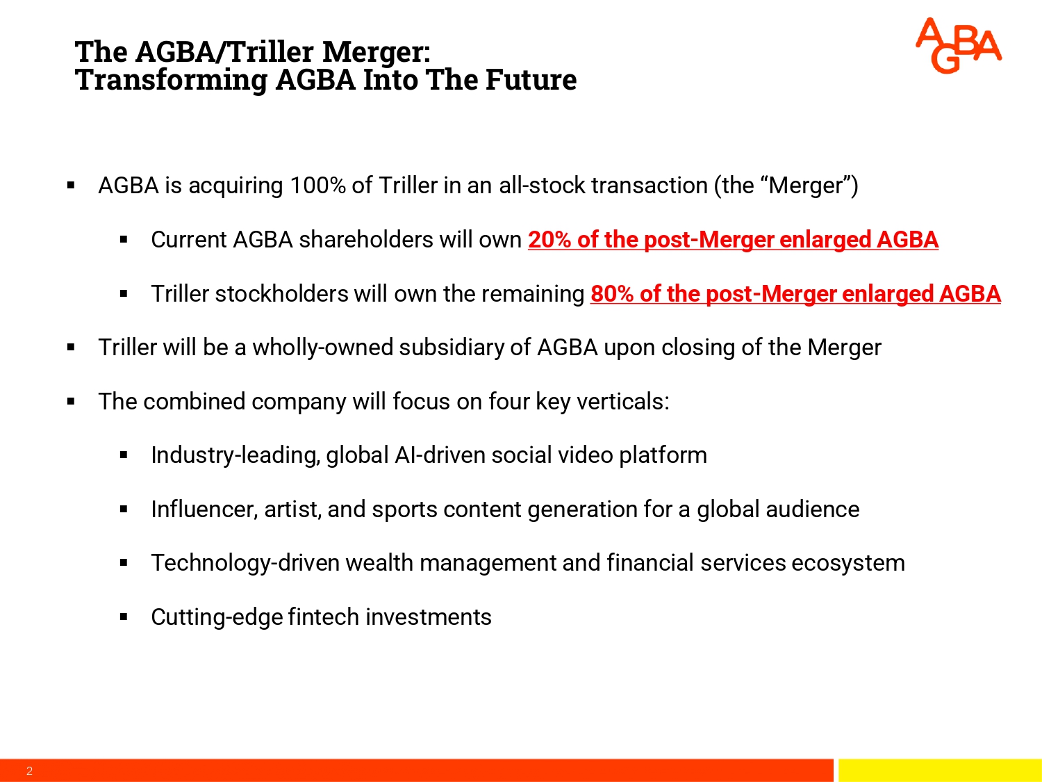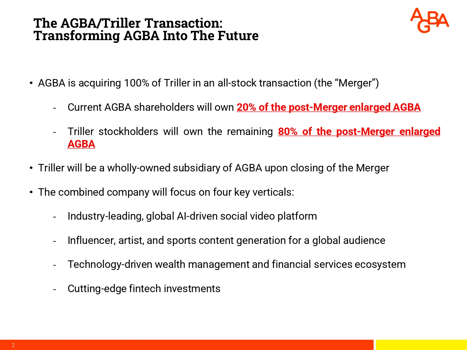 | ● | At closing, Triller will be a wholly-owned subsidiary of AGBA. |