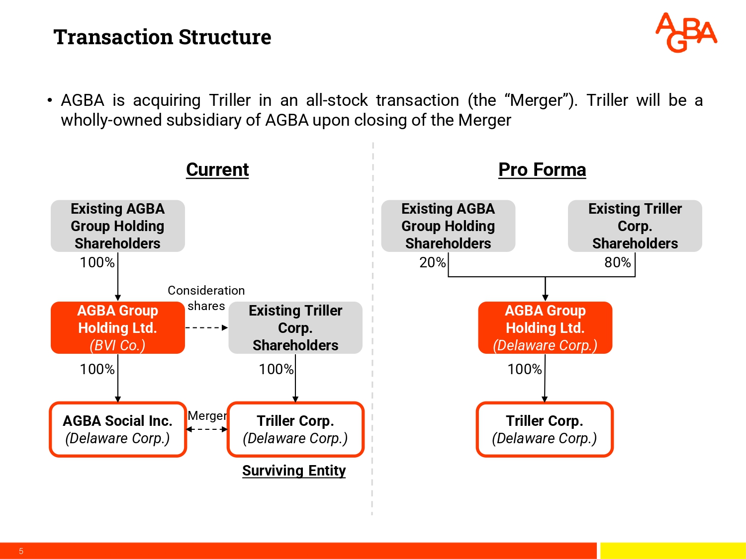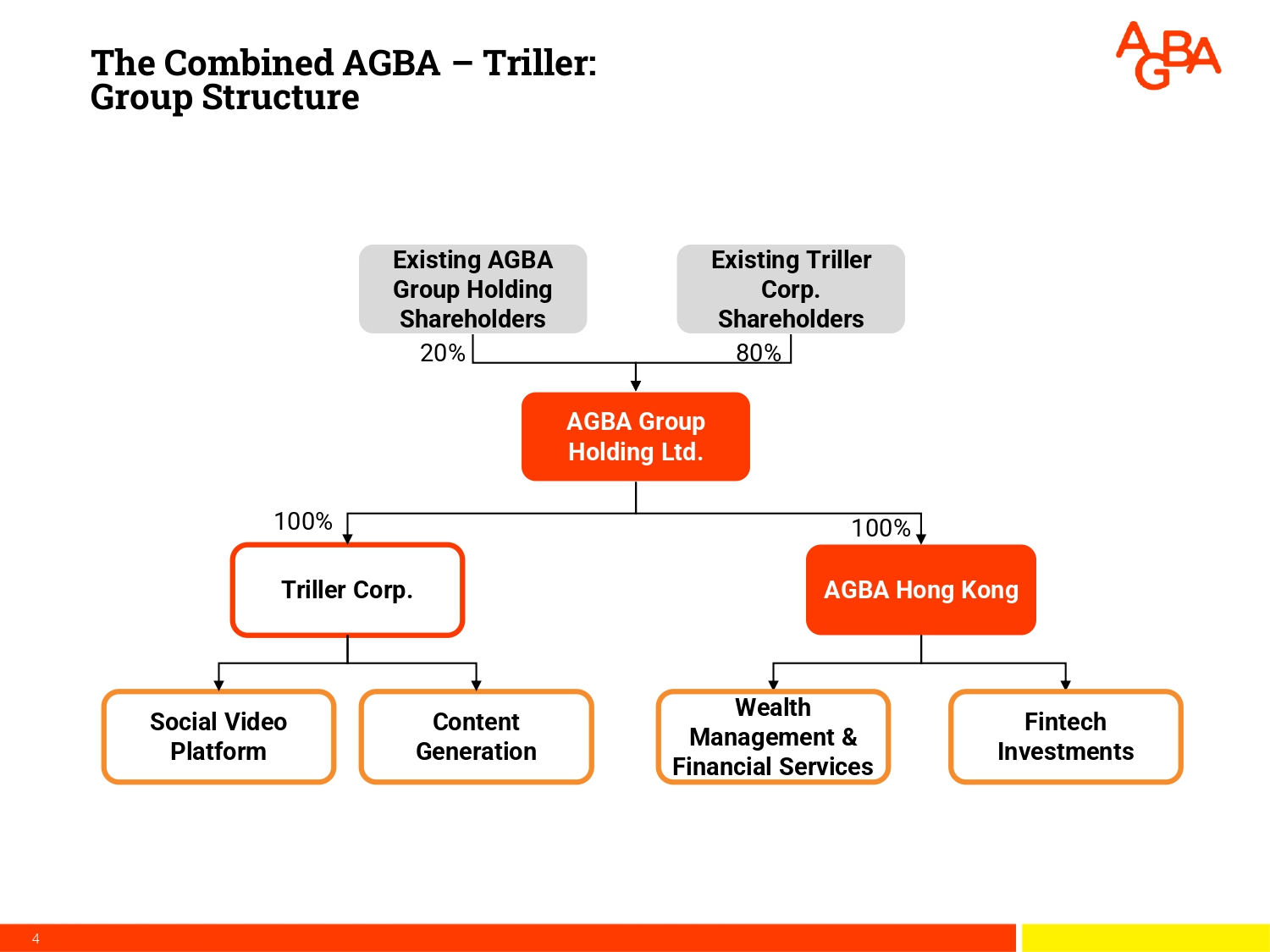At closing of the Business Combination, Triller will be a wholly-owned subsidiary of AGBA. The pro forma valuation of the combined company will be $4 billion, with the stockholders of Triller and the holders of Triller’s RSUs owning 80% of the post-Merger Group, and AGBA shareholders owning 20% of the post-Merger Group.