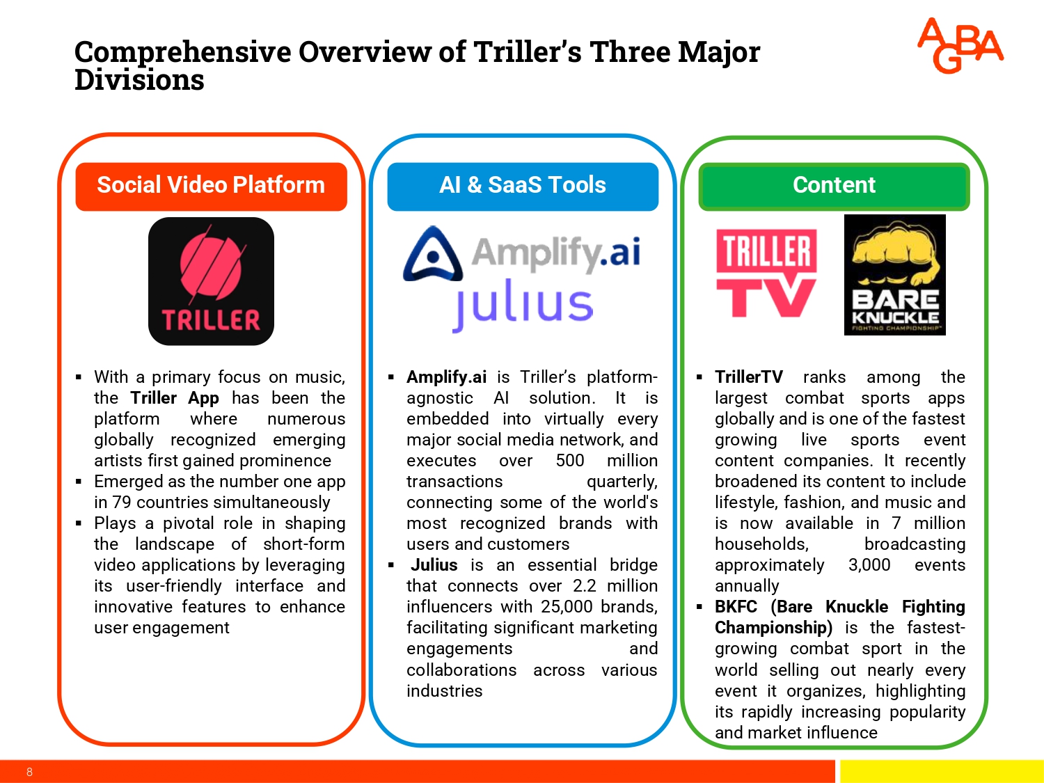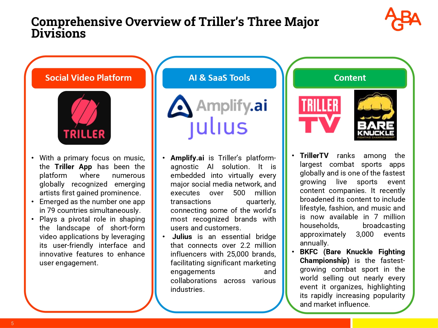 Comprehensive Overview of Triller’s Three Major Divisions 5 5 5 Social Video Platform AI & SaaS Tools Content • With a primary focus on music, the Triller App has been the platform where numerous globally recognized emerging artists first gained prominence . • Emerged as the number one app in 79 countries simultaneously . • Plays a pivotal role in shaping the landscape of short - form video applications by leveraging its user - friendly interface and innovative features to enhance user engagement . • Amplify . ai is Triller’s platform - agnostic AI solution . It is embedded into virtually every major social media network, and executes over 500 million transactions quarterly, connecting some of the world's most recognized brands with users and customers . • Julius is an essential bridge that connects over 2 . 2 million influencers with 25 , 000 brands, facilitating significant marketing engagements and collaborations across various industries . • TrillerTV ranks among the largest combat sports apps globally and is one of the fastest growing live sports event content companies . It recently broadened its content to include lifestyle, fashion, and music and is now available in 7 million households, broadcasting approximately 3 , 000 events annually . • BKFC (Bare Knuckle Fighting Championship) is the fastest - growing combat sport in the world selling out nearly every event it organizes, highlighting its rapidly increasing popularity and market influence .