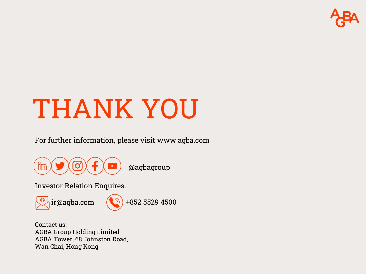 THANK YOU For further information, please visit www.agba.com Investor Relation Enquires: @agbagroup ir@agba.com +852 5529 4500 Contact us: AGBA Group Holding Limited AGBA Tower, 68 Johnston Road, Wan Chai, Hong Kong