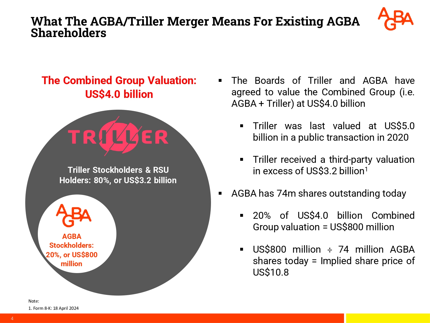 What The AGBA/Triller Transaction Means For Existing AGBA Shareholders 3 3 3 The Combined Group Valuation: US$4.0 billion Triller Stockholders & RSU Holders: 80%, or US$3.2 billion AGBA Stockholders: 20%, or US$800 million ▪ The Boards of Triller and AGBA have agreed to value the Combined Group (i . e . AGBA + Triller) at US $ 4 . 0 billion - Triller was last valued at US $ 5 . 0 billion in a public transaction in 2020 - Triller received a third - party valuation in excess of US$3.2 billion 1 ▪ AGBA has 74 m shares outstanding today - 20 % of US $ 4 . 0 billion Combined Group valuation = US $ 800 million - US $ 800 million ÷ 74 million AGBA shares today = Implied share price of US $ 10 . 8 Note: 1 . Form 8 - K, April 17, 2024