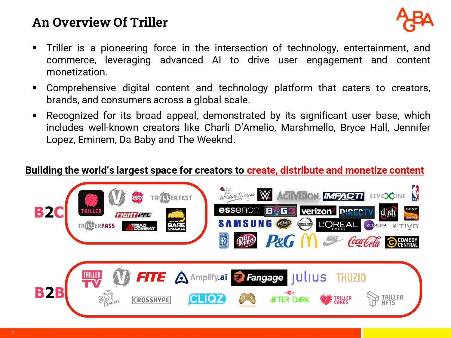 ▪ Triller is a pioneering force in the intersection of technology, entertainment, and commerce, leveraging advanced AI to drive user engagement and content monetization . ▪ Comprehensive digital content and technology platform that caters to creators, brands, and consumers across a global scale . ▪ Recognized for its broad appeal, demonstrated by its significant user base, which includes well - known creators like Charli D’Amelio , Marshmello , Bryce Hall, Jennifer Lopez, Eminem, Da Baby and The Weeknd . An Overview Of Triller 7 7 7 B 2 B B 2 C Building the world’s largest space for creators to create, distribute and monetize content