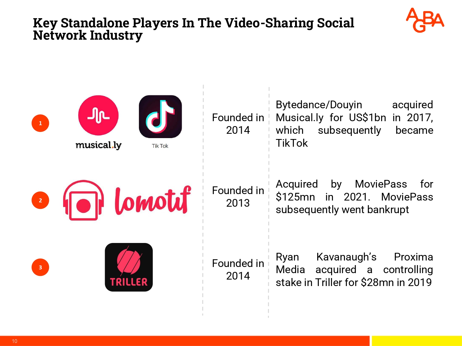 Bytedance / Douyin acquired Musical . ly for US $ 1 bn in 2017 , which subsequently became TikTok Founded in 2014 Acquired by MoviePass for $ 125 mn in 2021 . MoviePass subsequently went bankrupt Founded in 2013 Ryan Kavanaugh’s Proxima Media acquired a controlling stake in Triller for $ 28 mn in 2019 Founded in 2014 Key Standalone Players In The Video - Sharing Social Network Industry 10 10 10 1 2 3