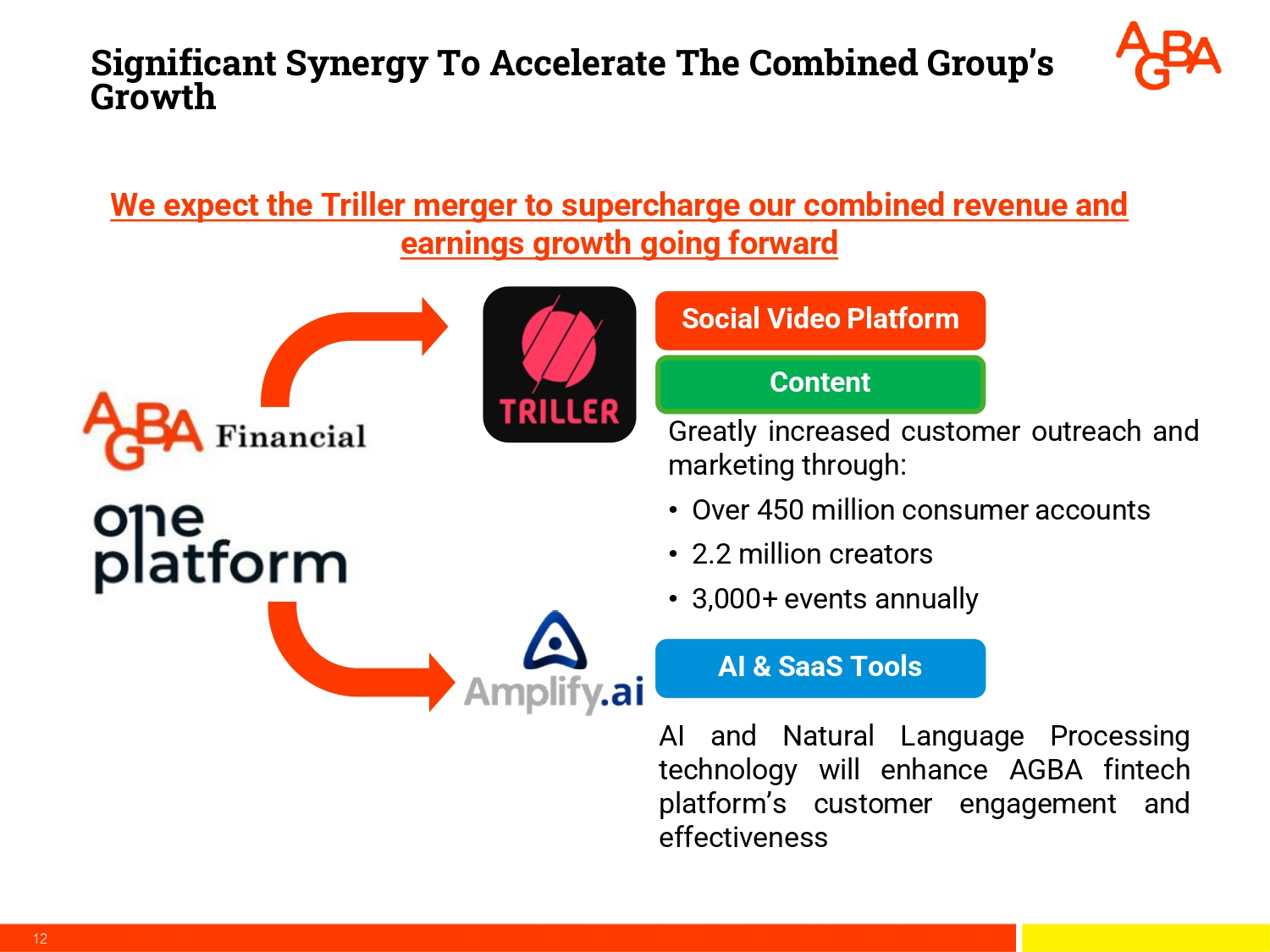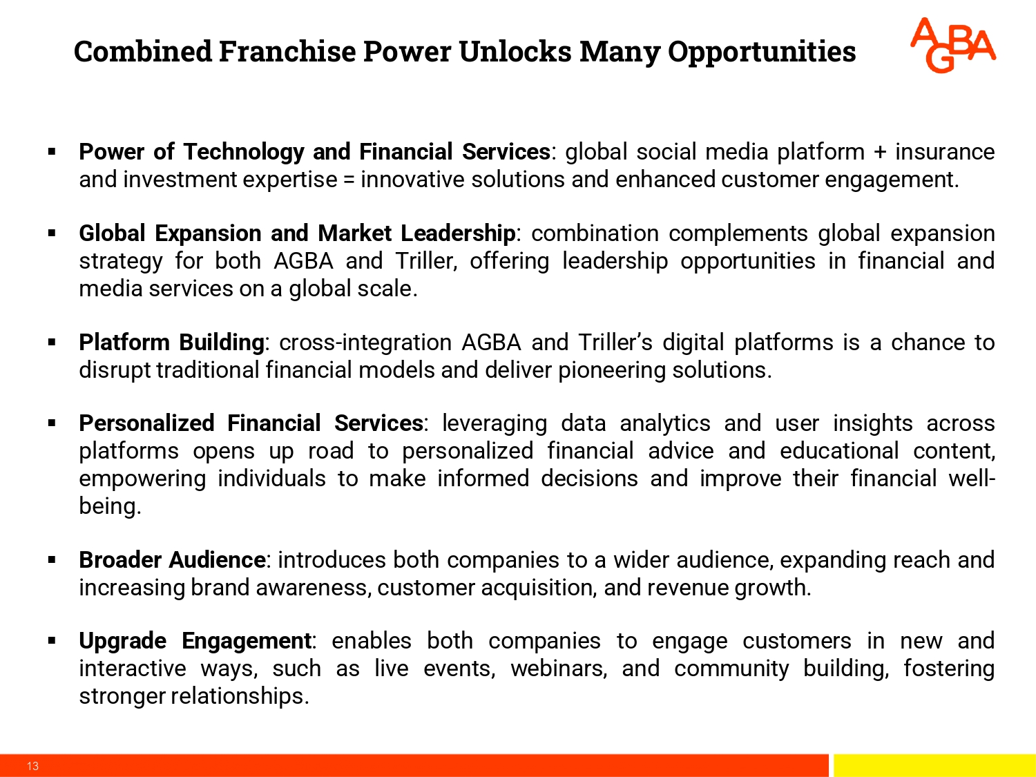 Significant Synergy To Accelerate The Combined Group’s Growth 12 12 12 Content Social Video Platform AI & SaaS Tools Greatly increased customer outreach and marketing through : • Over 450 million consumer accounts • 2 . 2 million creators • 3 , 000 + events annually AI and Natural Language Processing technology will enhance AGBA fintech platform’s customer engagement and effectiveness We expect the Triller merger to supercharge our combined revenue and earnings growth going forward