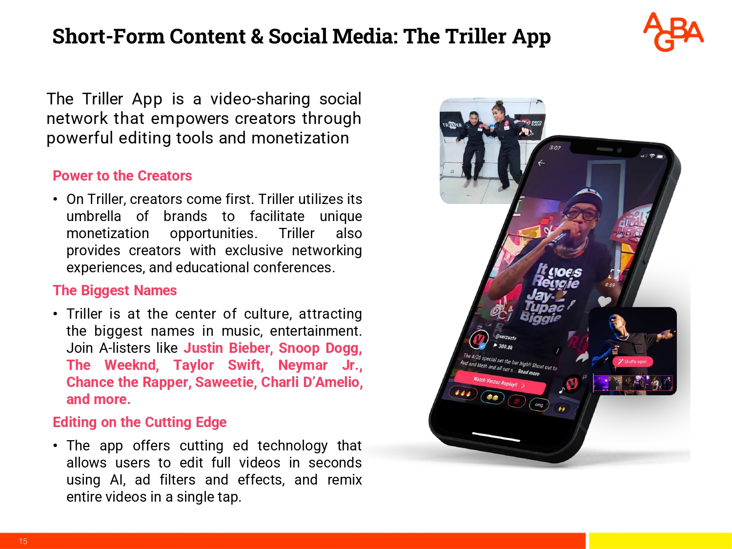Short - Form Content & Social Media: The Triller App 15 15 15 The Triller App is a video - sharing social network that emp owers creators through powerful editing tools and monetization Power to the Creators • On Triller, creators come first . Triller utilizes its umbrella of brands to facilitate unique monetization opportunities . Triller also provides creators with exclusive networking experiences, and educational conferences . The Biggest Names • Triller is at the center of culture, attracting the biggest names in music, entertainment . Join A - listers like Justin Bieber, Snoop Dogg, The Weeknd , Taylor Swift, Neymar Jr . , Chance the Rapper, Saweetie, Charli D’Amelio , and more . Editing on the Cutting Edge • The app offers cutting ed technology that allows users to edit full videos in seconds using AI, ad filters and effects, and remix entire videos in a single tap .