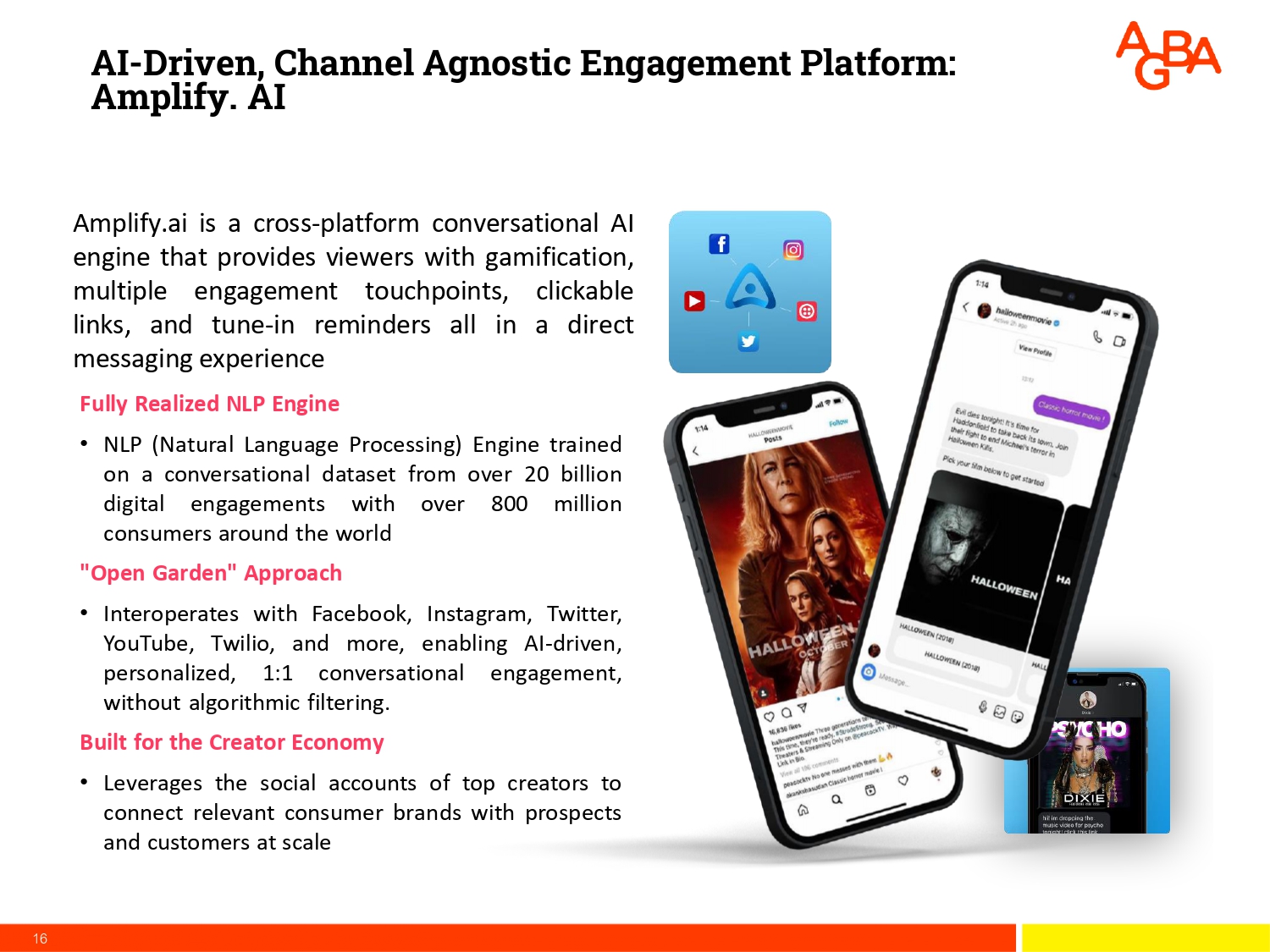 AI - Driven, Channel Agnostic Engagement Platform: Amplify. AI 16 16 16 Amplify . ai is a cross - platform conversational AI engine that provides viewers with gamification, multiple engagement touchpoints, clickable links, and tune - in reminders all in a direct messaging experience Fully Realized NLP Engine • NLP (Natural Language Processing) Engine trained on a conversational dataset from over 20 billion digital engagements with over 800 million consumers around the world "Open Garden" Approach • Interoperates with Facebook, Instagram, Twitter, YouTube, Twilio, and more, enabling AI - driven, personalized, 1 : 1 conversational engagement, without algorithmic filtering . Built for the Creator Economy • Leverages the social accounts of top creators to connect relevant consumer brands with prospects and customers at scale