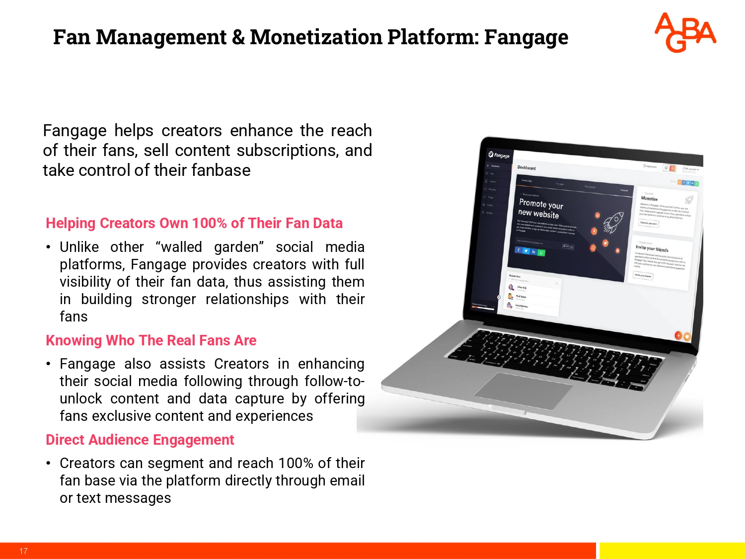 Fan Management & Monetization Platform: Fangage 17 17 17 Fangage helps creators enhance the reach of their fans, sell content subscriptions, and take control of their fanbase Helping Creators Own 100 % of Their Fan Data • Unlike other “walled garden” social media platforms, Fangage provides creators with full visibility of their fan data, thus assisting them in building stronger relationships with their fans Knowing Who The Real Fans Are • Fangage also assists Creators in enhancing their social media following through follow - to - unlock content and data capture by offering fans exclusive content and experiences Direct Audience Engagement • Creators can segment and reach 100 % of their fan base via the platform directly through email or text messages