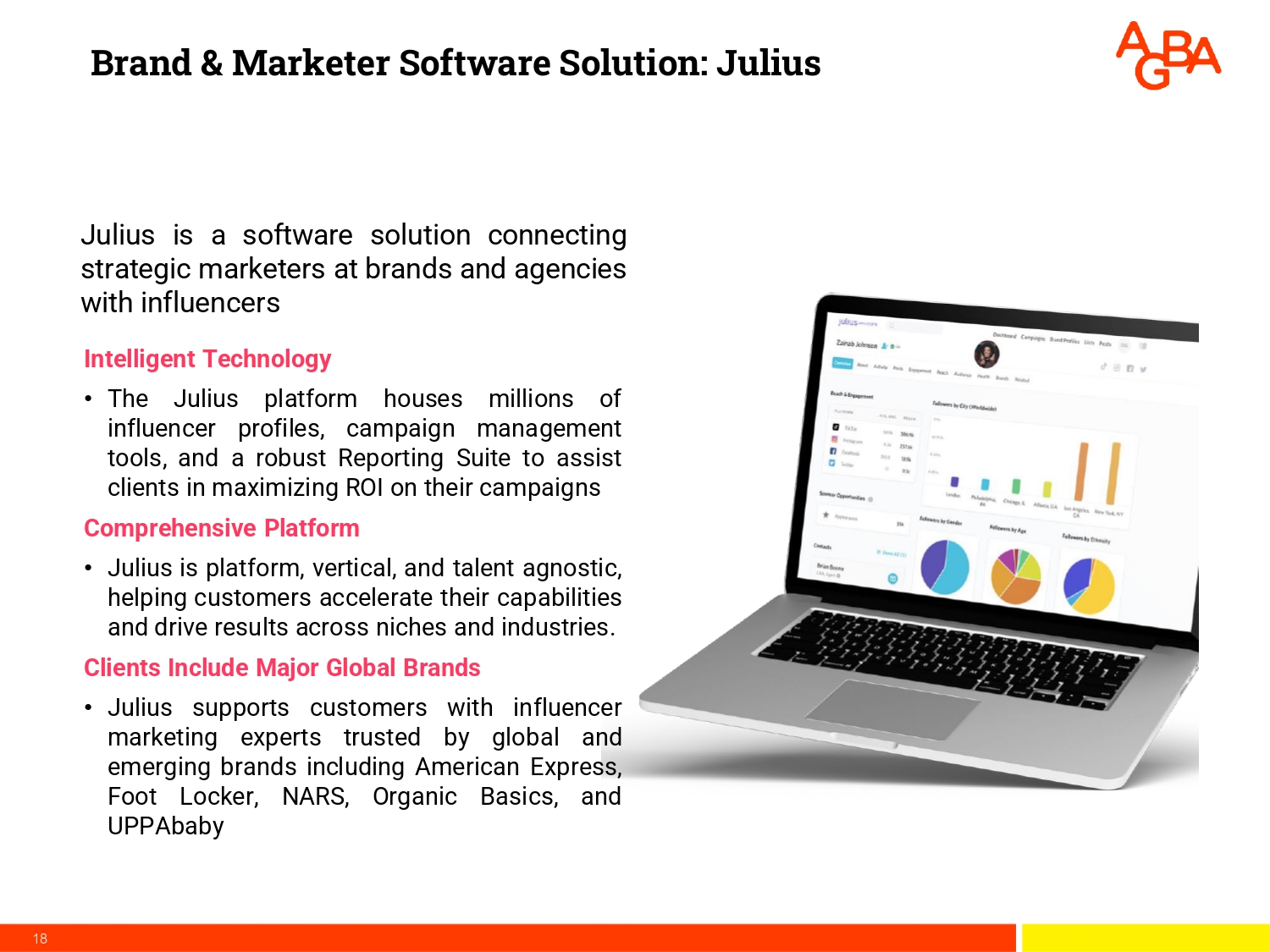 Brand & Marketer Software Solution: Julius 18 18 18 Julius is a software solution connecting strategic marketers at brands and agencies with influencers Intelligent Technology • The Julius platform houses millions of influencer profiles, campaign management tools, and a robust Reporting Suite to assist clients in maximizing ROI on their campaigns Comprehensive Platform • Julius is platform, vertical, and talent agnostic, helping customers accelerate their capabilities and drive results across niches and industries . Clients Include Major Global Brands • Julius supports customers with influencer marketing experts trusted by global and emerging brands including American Express, Foot Locker, NARS, Organic Basics, and UPPAbaby