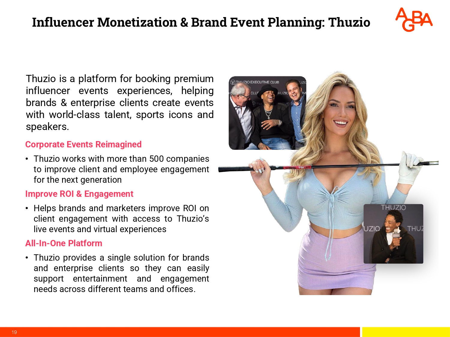 Influencer Monetization & Brand Event Planning: Thuzio 19 19 19 Thuzio is a platform for booking premium influencer events experiences, helping brands & enterprise clients create events with world - class talent, sports icons and speakers . Corporate Events Reimagined • Thuzio works with more than 500 companies to improve client and employee engagement for the next generation Improve ROI & Engagement • Helps brands and marketers improve ROI on client engagement with access to Thuzio’s live events and virtual experiences All - In - One Platform • Thuzio provides a single solution for brands and enterprise clients so they can easily support entertainment and engagement needs across different teams and offices .