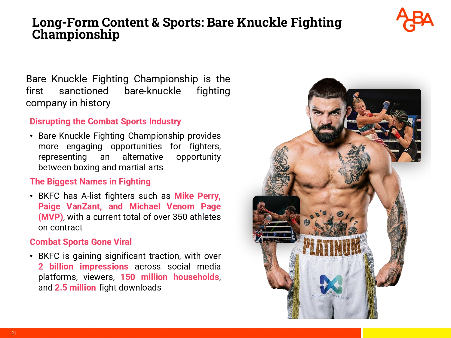 Long - Form Content & Sports: Bare Knuckle Fighting Championship 21 21 21 Bare Knuckle Fighting Championship is the first sanctioned bare - knuckle fighting company in history Disrupting the Combat Sports Industry • Bare Knuckle Fighting Championship provides more engaging opportunities for fighters, representing an alternative opportunity between boxing and martial arts The Biggest Names in Fighting • BKFC has A - list fighters such as Mike Perry, Paige VanZant, and Michael Venom Page (MVP) , with a current total of over 350 athletes on contract Combat Sports Gone Viral • BKFC is gaining significant traction, with over 2 billion impressions across social media platforms, viewers, 150 million households , and 2 . 5 million fight downloads