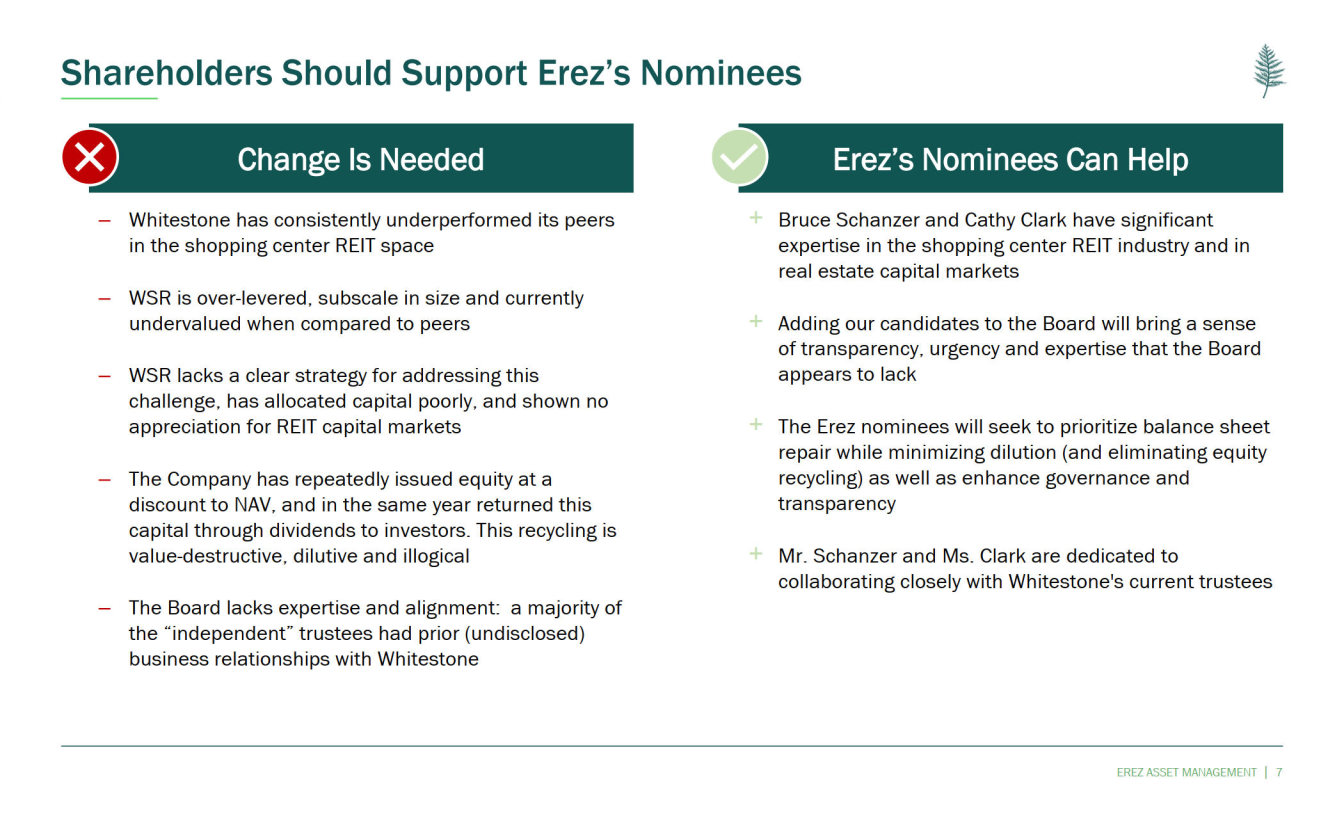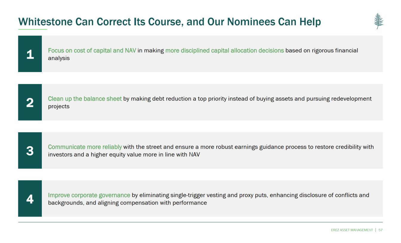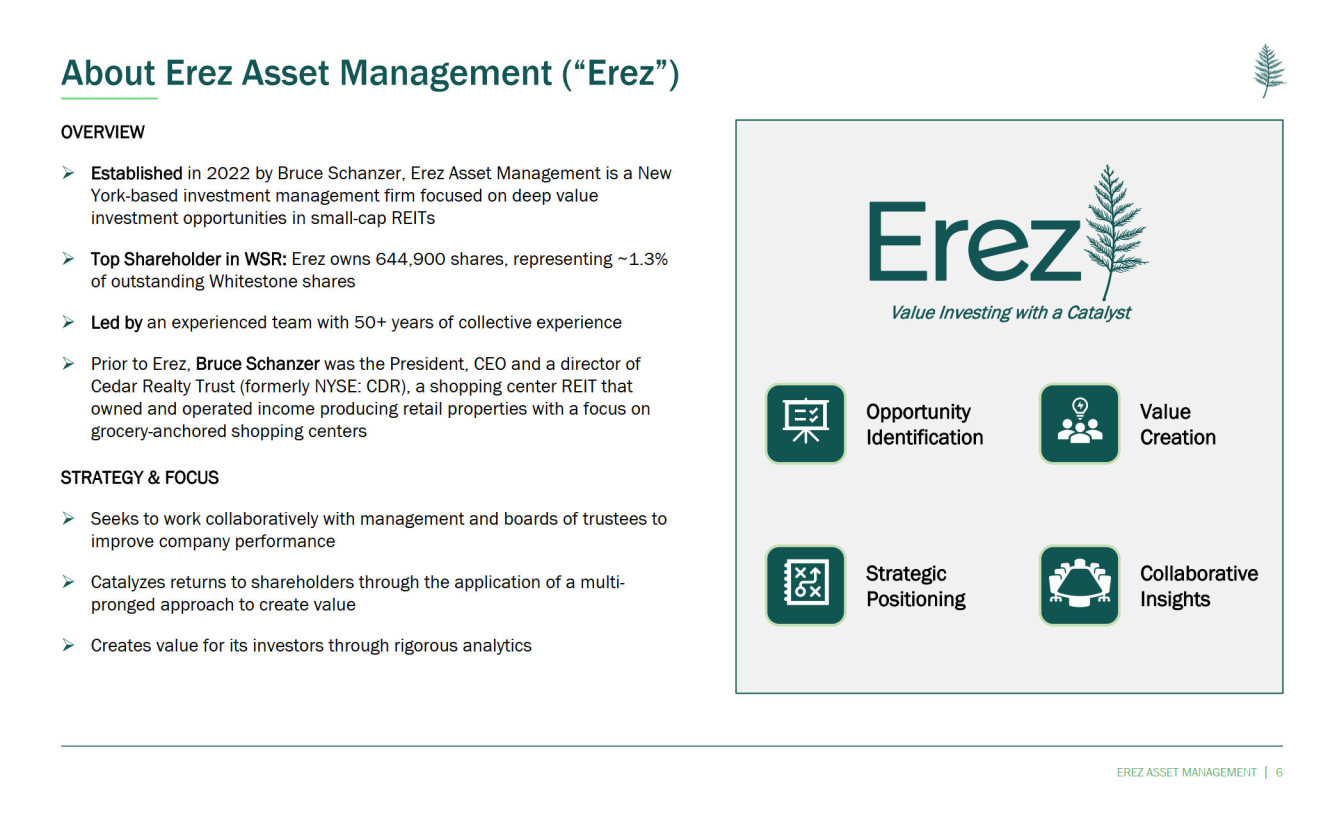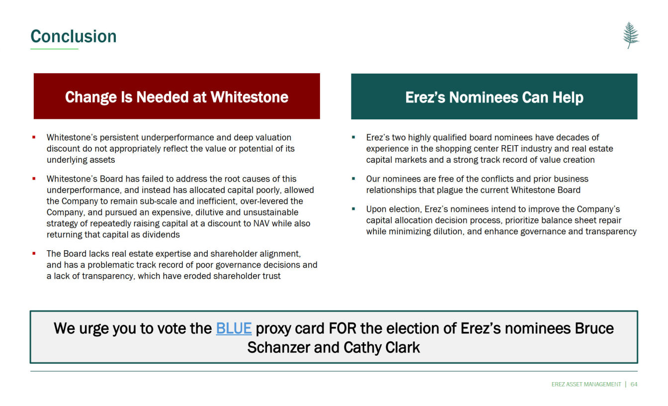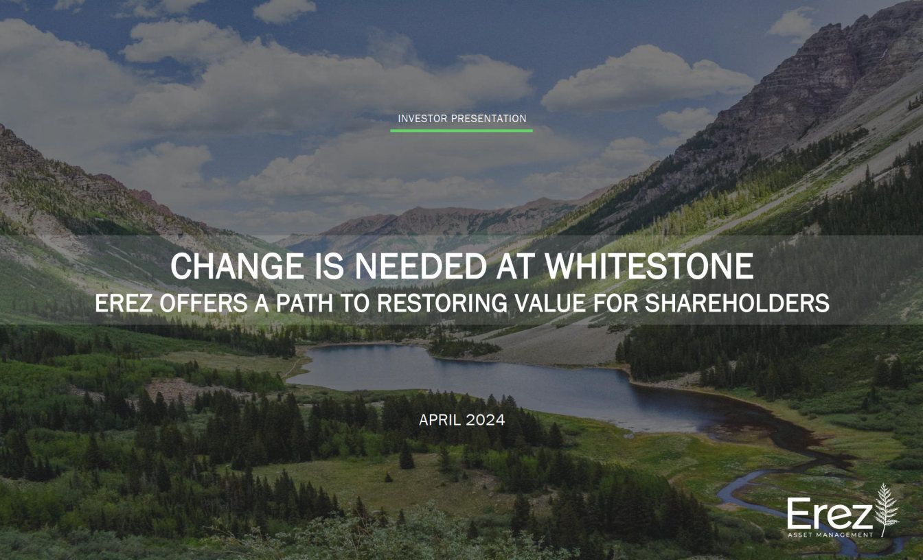 On April 22, 2024, Erez and its affiliates issued the following Investor Presentation titled “Change is Needed at Whitestone: Erez Offers a Path to Restoring