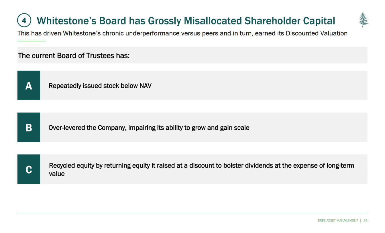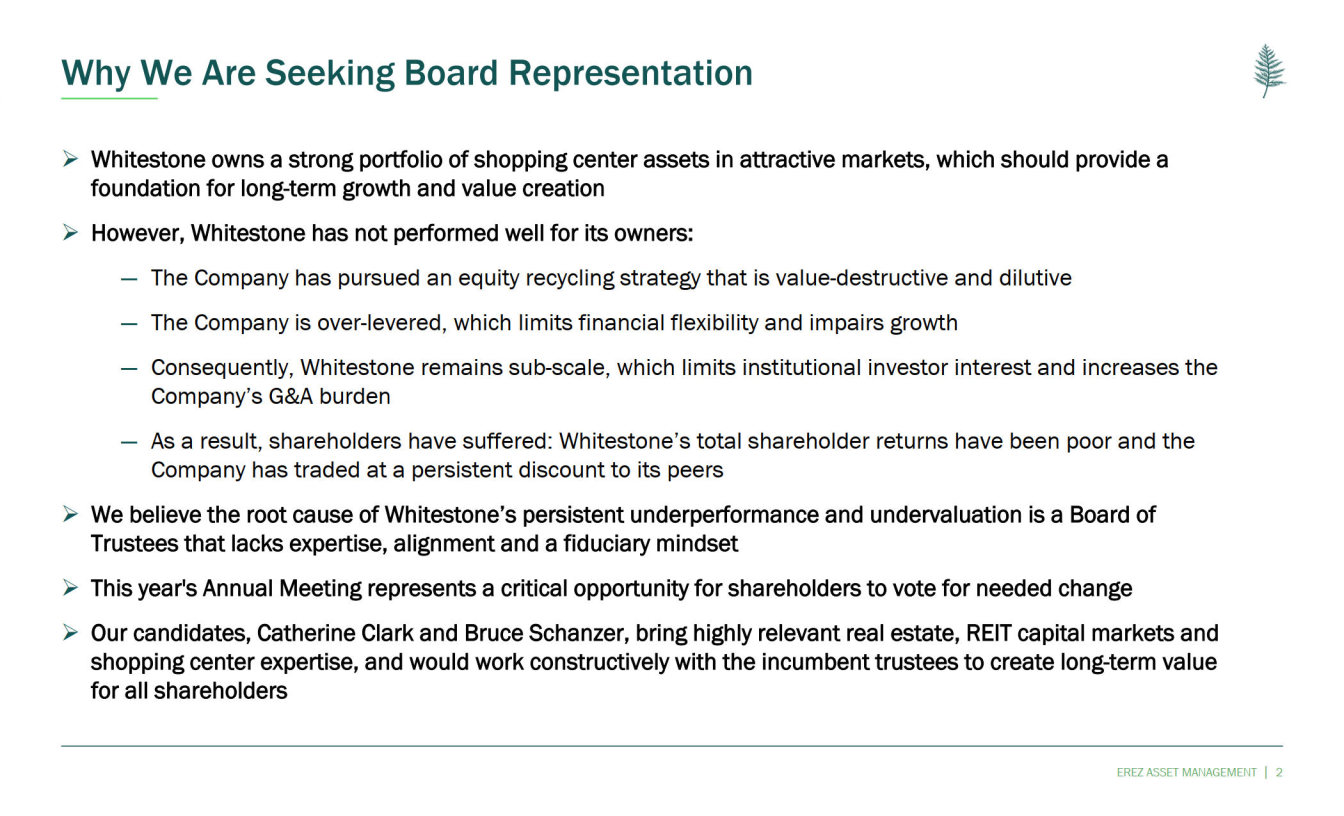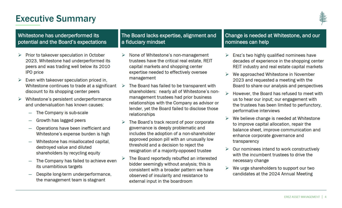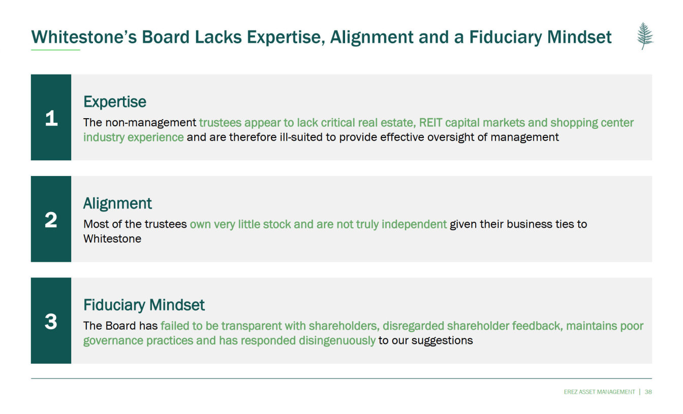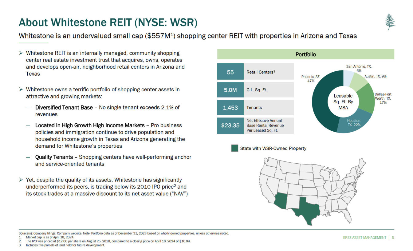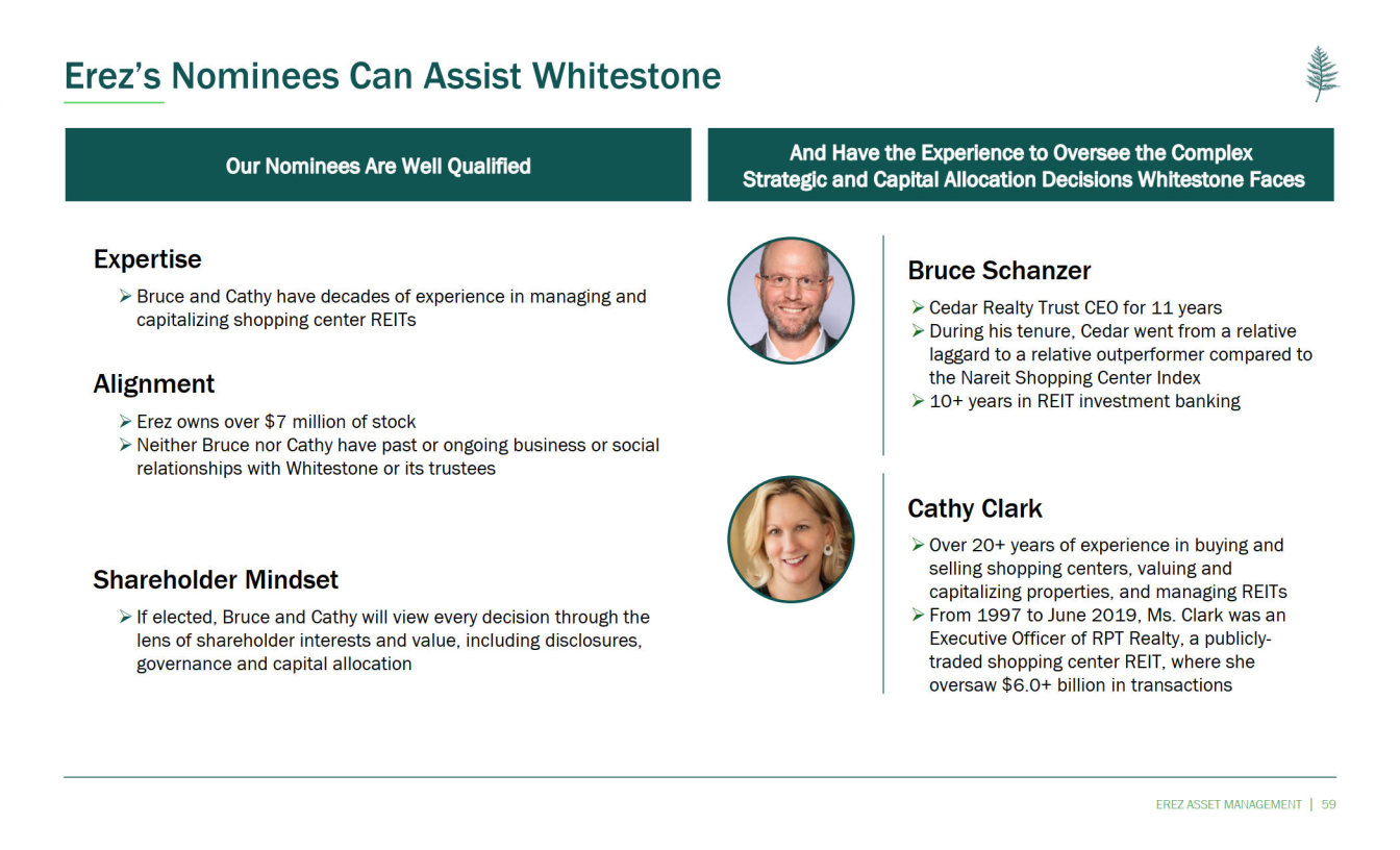On April 22, 2024, Erez and its affiliates issued the following Investor Presentation titled “Change is Needed at Whitestone: Erez Offers a Path to Restoring