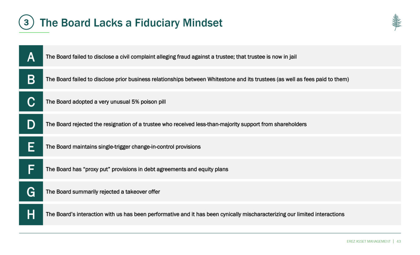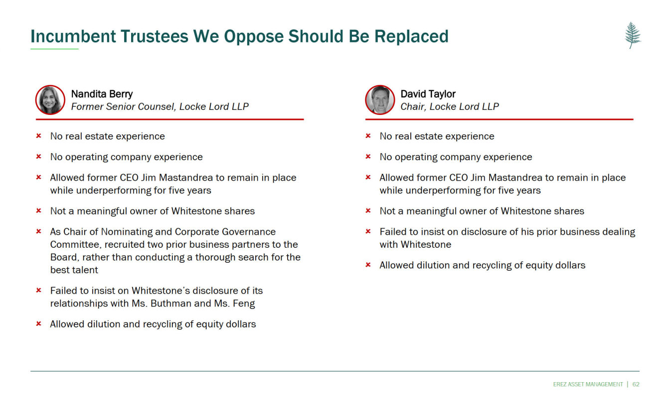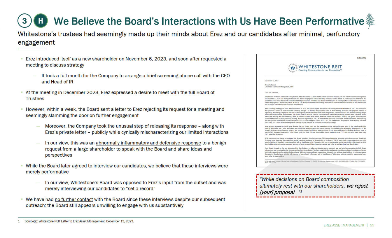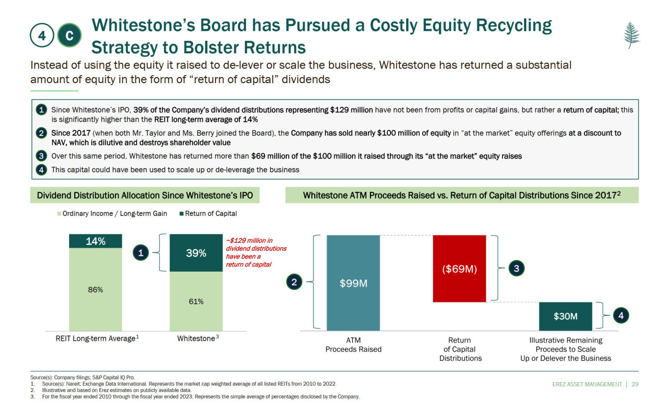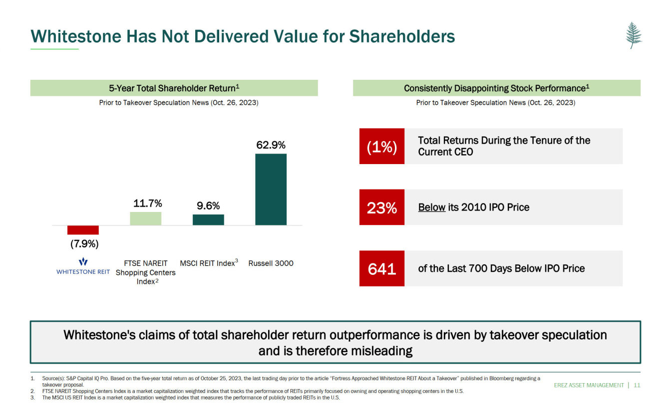 On April 22, 2024, Erez and its affiliates issued the following Investor Presentation titled “Change is Needed at Whitestone: Erez Offers a Path to Restoring