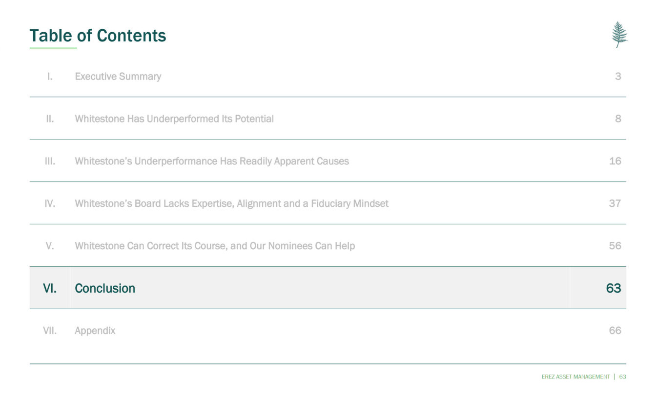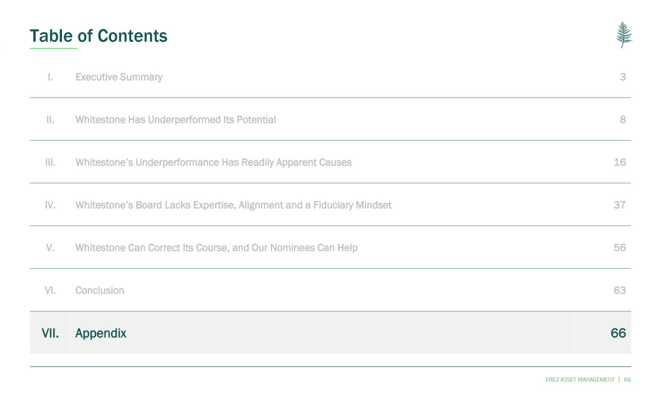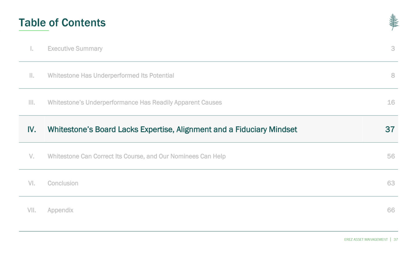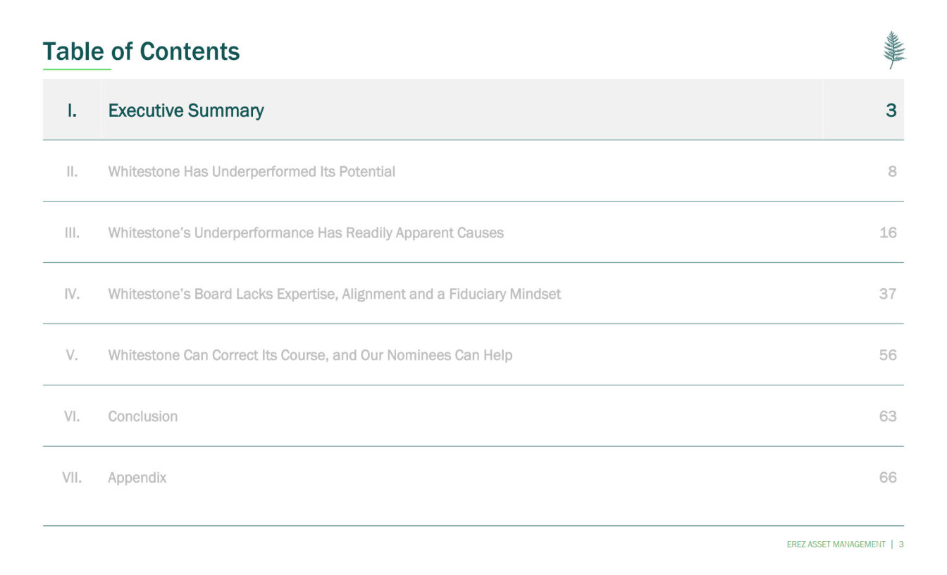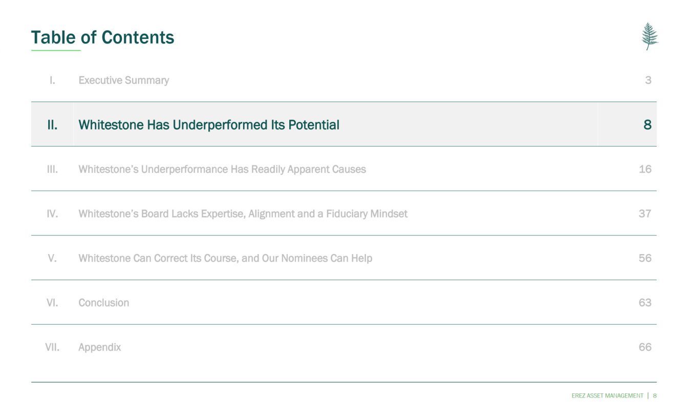 On April 22, 2024, Erez and its affiliates issued the following Investor Presentation titled “Change is Needed at Whitestone: Erez Offers a Path to Restoring