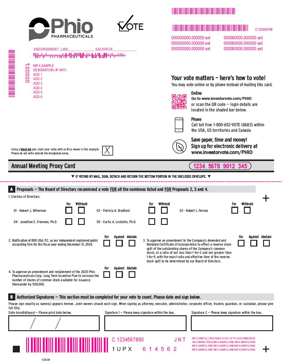 | (3) | an amendment and restatement of the 2020 Phio Pharmaceuticals Corp. Long Term Incentive Plan to increase the number of shares of common stock available for issuance thereunder by 500,000; and | |