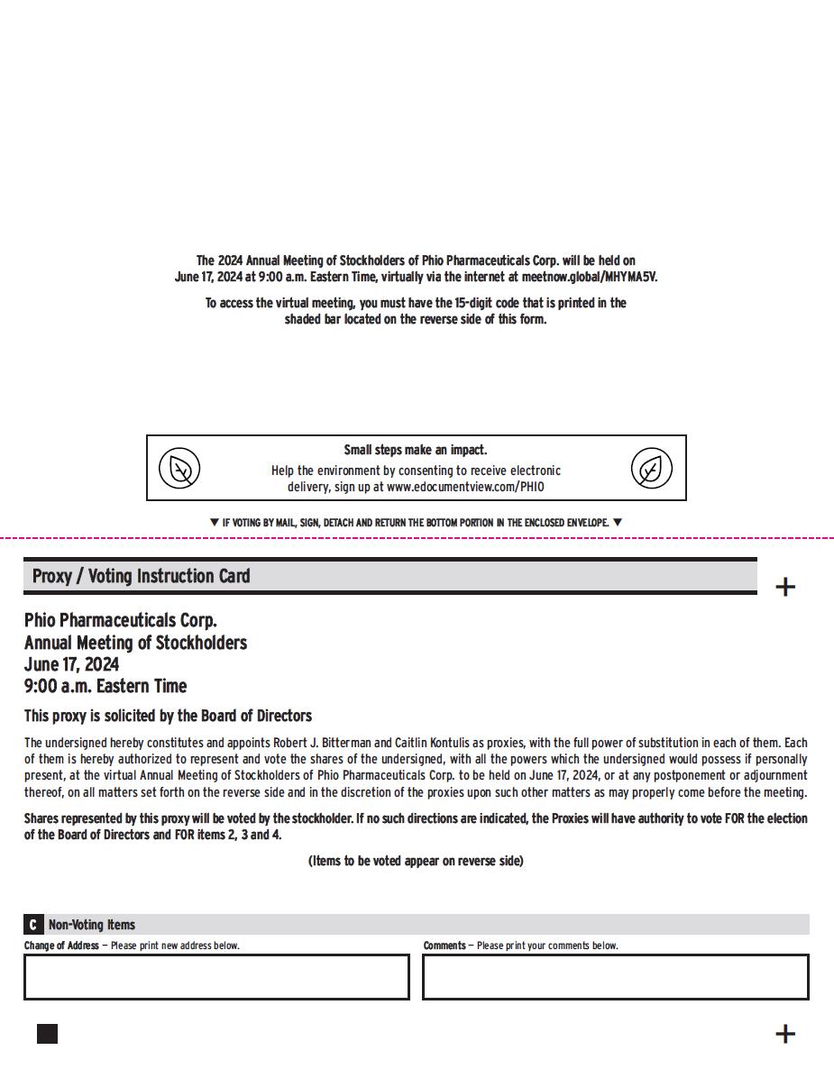 You are cordially invited to attend the 2024 Annual Meeting of Stockholders (the “Annual Meeting”) of Phio Pharmaceuticals Corp., a Delaware corporation (the “Company”), which will be held on June 17, 2024, at 9:00 a.m. (Eastern Time). The meeting will be a completely virtual meeting of stockholders. You can attend the meeting by visiting meetnow.global/MHYMA5V where you will be able to listen to the meeting live, submit questions, view the stockholder list, and vote online. Because the meeting is completely virtual and being conducted via the internet, stockholders will not be able to attend the meeting in person physically.