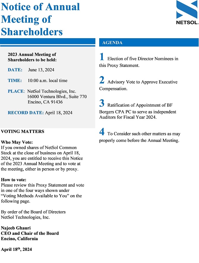 The Board of Directors of NetSol Technologies, Inc. is soliciting proxies to be voted at our 2023 Annual Meeting of Shareholders on June 13, 2024, and at any postponed or reconvened meeting. We expect that the proxy materials or a notice of internet availability will be mailed and made available to shareholders beginning on or about April 24, 2024. At the meeting, votes will be taken on the matters listed in the Notice of 2023 Annual Meeting of Shareholders.