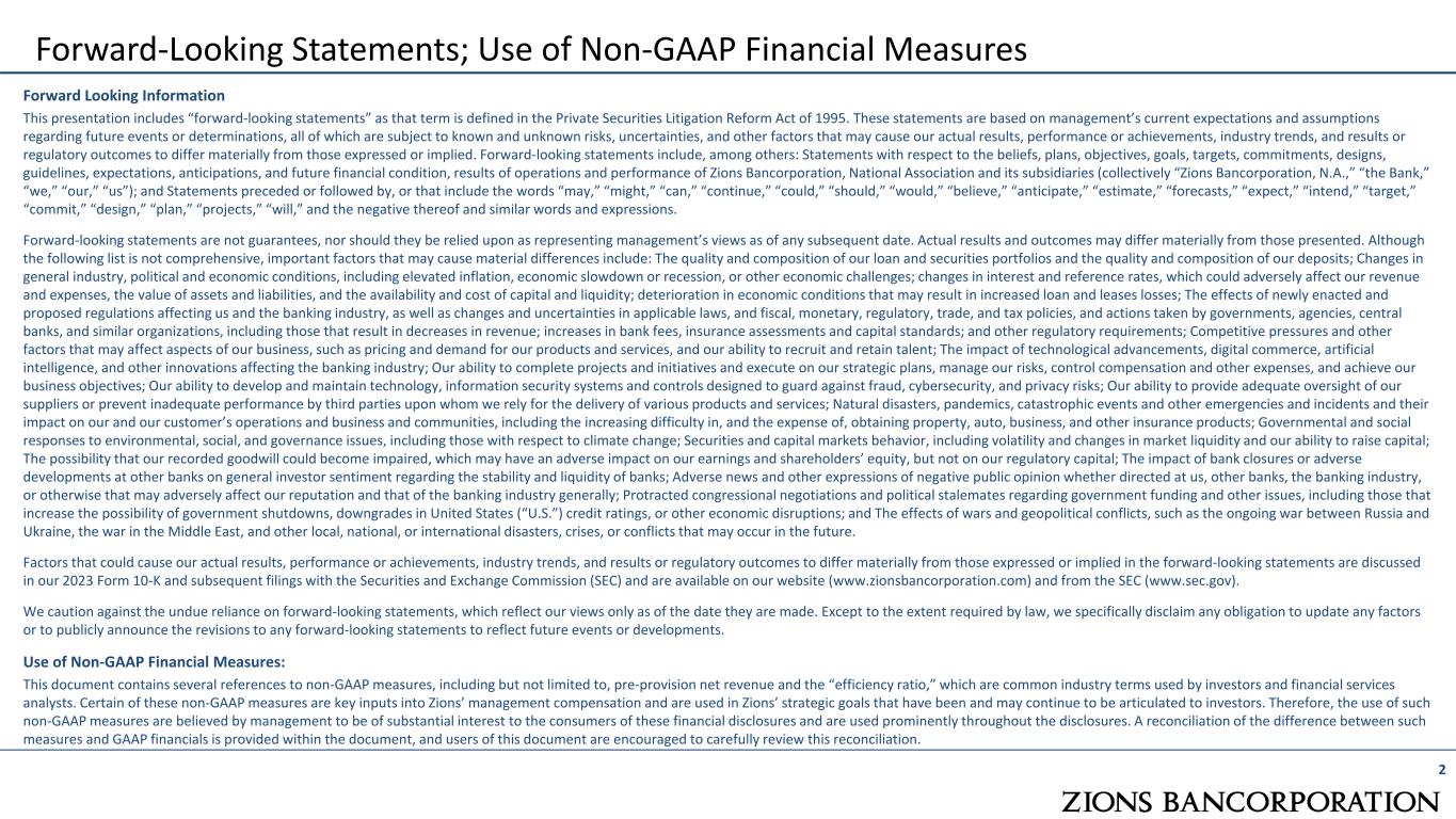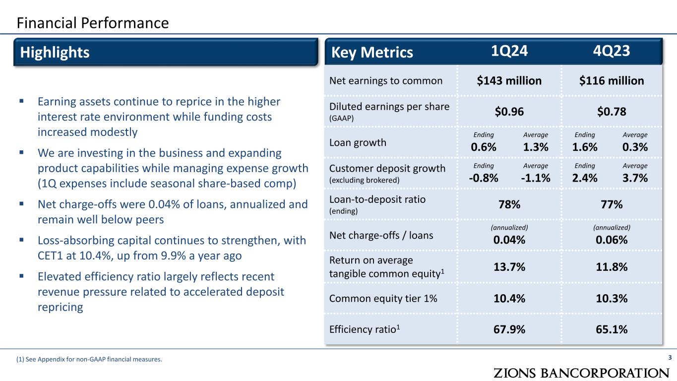 2 Forward-Looking Statements; Use of Non-GAAP Financial Measures Forward Looking Information This presentation includes “forward-looking statements” as that term is defined in the Private Securities Litigation Reform Act of 1995. These statements are based on management’s current expectations and assumptions regarding future events or determinations, all of which are subject to known and unknown risks, uncertainties, and other factors that may cause our actual results, performance or achievements, industry trends, and results or regulatory outcomes to differ materially from those expressed or implied. Forward-looking statements include, among others: Statements with respect to the beliefs, plans, objectives, goals, targets, commitments, designs, guidelines, expectations, anticipations, and future financial condition, results of operations and performance of Zions Bancorporation, National Association and its subsidiaries (collectively “Zions Bancorporation, N.A.,” “the Bank,” “we,” “our,” “us”); and Statements preceded or followed by, or that include the words “may,” “might,” “can,” “continue,” “could,” “should,” “would,” “believe,” “anticipate,” “estimate,” “forecasts,” “expect,” “intend,” “target,” “commit,” “design,” “plan,” “projects,” “will,” and the negative thereof and similar words and expressions. Forward-looking statements are not guarantees, nor should they be relied upon as representing management’s views as of any subsequent date. Actual results and outcomes may differ materially from those presented. Although the following list is not comprehensive, important factors that may cause material differences include: The quality and composition of our loan and securities portfolios and the quality and composition of our deposits; Changes in general industry, political and economic conditions, including elevated inflation, economic slowdown or recession, or other economic challenges; changes in interest and reference rates, which could adversely affect our revenue and expenses, the value of assets and liabilities, and the availability and cost of capital and liquidity; deterioration in economic conditions that may result in increased loan and leases losses; The effects of newly enacted and proposed regulations affecting us and the banking industry, as well as changes and uncertainties in applicable laws, and fiscal, monetary, regulatory, trade, and tax policies, and actions taken by governments, agencies, central banks, and similar organizations, including those that result in decreases in revenue; increases in bank fees, insurance assessments and capital standards; and other regulatory requirements; Competitive pressures and other factors that may affect aspects of our business, such as pricing and demand for our products and services, and our ability to recruit and retain talent; The impact of technological advancements, digital commerce, artificial intelligence, and other innovations affecting the banking industry; Our ability to complete projects and initiatives and execute on our strategic plans, manage our risks, control compensation and other expenses, and achieve our business objectives; Our ability to develop and maintain technology, information security systems and controls designed to guard against fraud, cybersecurity, and privacy risks; Our ability to provide adequate oversight of our suppliers or prevent inadequate performance by third parties upon whom we rely for the delivery of various products and services; Natural disasters, pandemics, catastrophic events and other emergencies and incidents and their impact on our and our customer’s operations and business and communities, including the increasing difficulty in, and the expense of, obtaining property, auto, business, and other insurance products; Governmental and social responses to environmental, social, and governance issues, including those with respect to climate change; Securities and capital markets behavior, including volatility and changes in market liquidity and our ability to raise capital; The possibility that our recorded goodwill could become impaired, which may have an adverse impact on our earnings and shareholders’ equity, but not on our regulatory capital; The impact of bank closures or adverse developments at other banks on general investor sentiment regarding the stability and liquidity of banks; Adverse news and other expressions of negative public opinion whether directed at us, other banks, the banking industry, or otherwise that may adversely affect our reputation and that of the banking industry generally; Protracted congressional negotiations and political stalemates regarding government funding and other issues, including those that increase the possibility of government shutdowns, downgrades in United States (“U.S.”) credit ratings, or other economic disruptions; and The effects of wars and geopolitical conflicts, such as the ongoing war between Russia and Ukraine, the war in the Middle East, and other local, national, or international disasters, crises, or conflicts that may occur in the future. Factors that could cause our actual results, performance or achievements, industry trends, and results or regulatory outcomes to differ materially from those expressed or implied in the forward-looking statements are discussed in our 2023 Form 10-K and subsequent filings with the Securities and Exchange Commission (SEC) and are available on our website (www.zionsbancorporation.com) and from the SEC (www.sec.gov). We caution against the undue reliance on forward-looking statements, which reflect our views only as of the date they are made. Except to the extent required by law, we specifically disclaim any obligation to update any factors or to publicly announce the revisions to any forward-looking statements to reflect future events or developments. Use of Non-GAAP Financial Measures: 