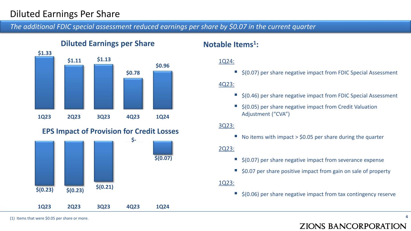 Key Metrics 3 Financial Performance Highlights  Earning assets continue to reprice in the higher interest rate environment while funding costs increased modestly  We are investing in the business and expanding product capabilities while managing expense growth (1Q expenses include seasonal share-based comp)  Net charge-offs were 0.04% of loans, annualized and remain well below peers  Loss-absorbing capital continues to strengthen, with CET1 at 10.4%, up from 9.9% a year ago  Elevated efficiency ratio largely reflects recent revenue pressure related to accelerated deposit repricing 1Q24 4Q23 Net earnings to common $143 million $116 million Diluted earnings per share (GAAP) $0.96 $0.78 Loan growth Ending 0.6% Average 1.3% Ending 1.6% Average 0.3% Customer deposit growth (excluding brokered) Ending -0.8% Average -1.1% Ending 2.4% Average 3.7% Loan-to-deposit ratio (ending) 78% 77% Net charge-offs / loans (annualized) 0.04% (annualized) 0.06% Return on average tangible common equity1 13.7% 11.8% Common equity tier 1% 10.4% 10.3% Efficiency ratio1 67.9% 65.1% (1) See Appendix for non-GAAP financial measures.