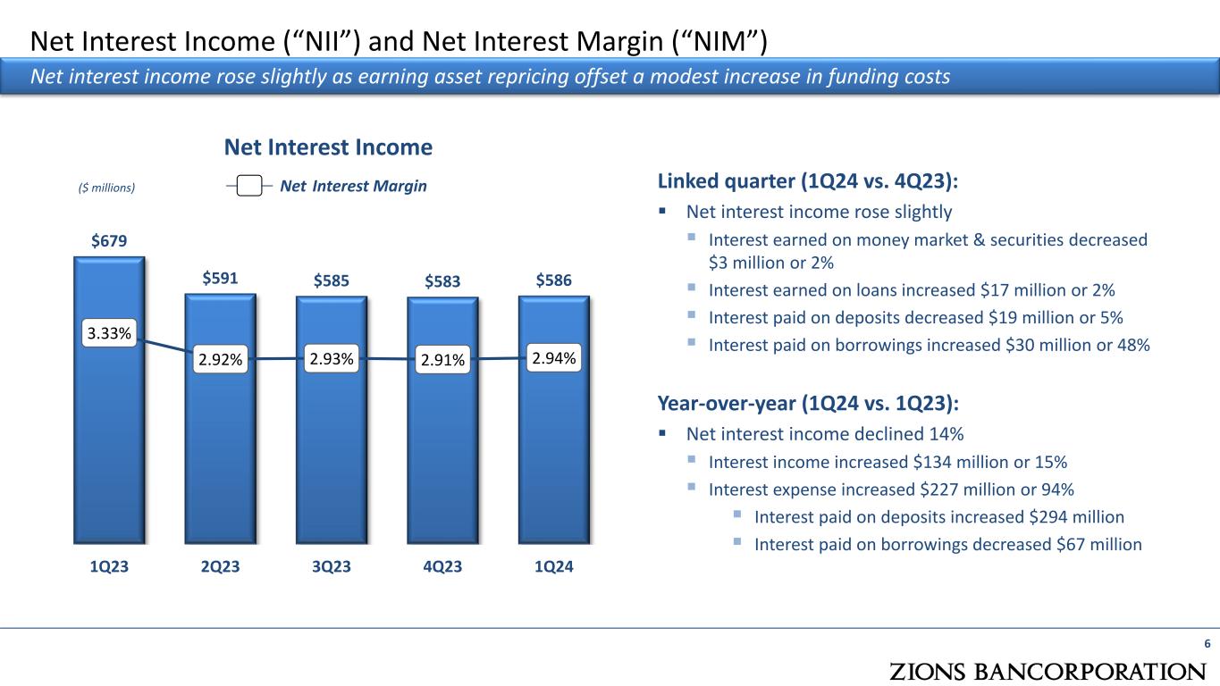 $3 36 $2 83 $2 80 $1 60 $2 26 $3 41 $2 96 $2 72 $2 62 $2 42 1Q23 2Q23 3Q23 4Q23 1Q24 Pre-provision net revenue (PPNR) (non-GAAP) Adjusted PPNR (non-GAAP) Pre-Provision Net Revenue (“PPNR”) Linked-quarter decline in Adjusted PPNR primarily from increased noninterest expense due to seasonality in compensation (1) PPNR includes taxable-equivalent revenue; Adjusted PPNR adjusts for items such as severance costs, restructuring costs, amortization of other intangibles, FDIC special assessment, and securities gains (losses). See Appendix for non-GAAP financial measures. PPNR1 ($ millions) 5 Linked quarter (1Q24 vs. 4Q23):  Adjusted PPNR decreased 8%:  Slightly increased net interest income  Stable customer-related noninterest income  Adjusted noninterest expense increase of 4% mainly attributable to seasonal expenses Year-over-year (1Q24 vs. 1Q23):  Adjusted PPNR decreased 29%:  Decrease of 13% in taxable-equivalent net interest income due to higher cost of funding  Increase of 94% in interest expense  Slightly increased adjusted noninterest expense