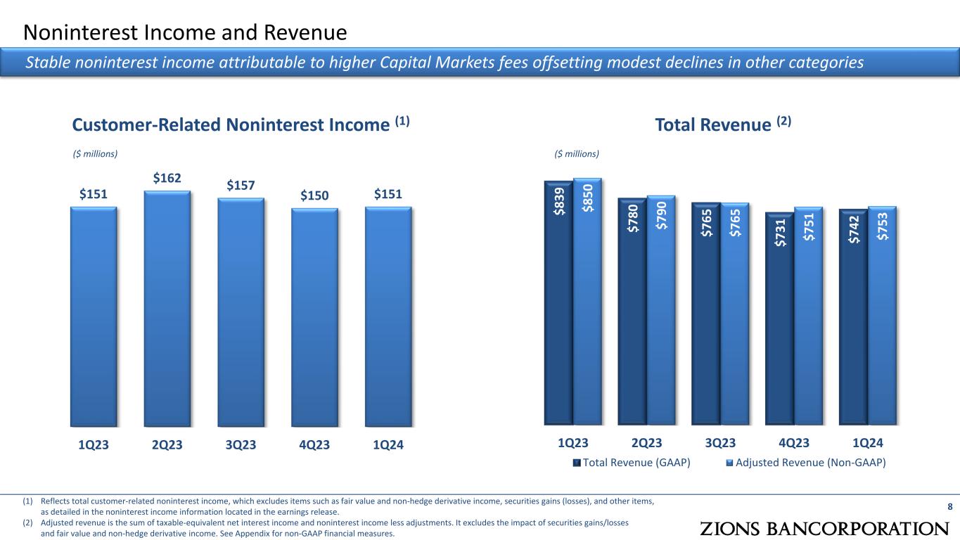 Year-Over-Year (1Q24 vs. 1Q23) Net Interest Margin (“NIM”) 7 The net interest margin has been relatively stable for the past four quarters Loans Deposits Money Mkt & Securities Borrowings Free Funds1 1Q23 1Q24 Linked Quarter (1Q24 vs. 4Q23) 4Q23 1Q24 Loans Deposits Money Mkt & Securities Borrowings Free Funds1 Earning asset yields continue to improve while rate of increase on liabilities slows (1) The impact of noninterest-bearing sources of funds on the net interest margin is calculated as the difference between interest earning assets and interest-bearing liabilities divided by earnings assets multiplied by rate paid on interest bearing liabilities.