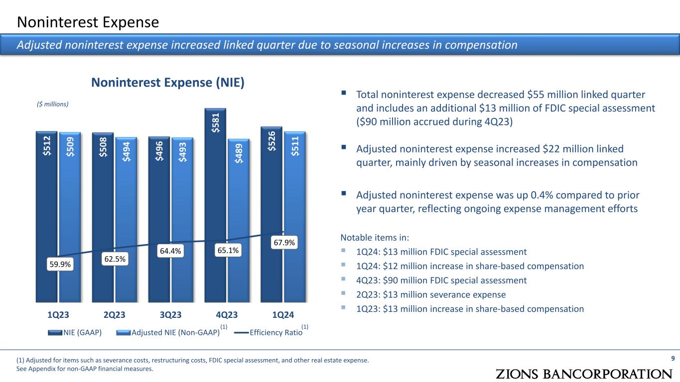 $151 $162 $157 $150 $151 1Q23 2Q23 3Q23 4Q23 1Q24 Noninterest Income and Revenue 8 Customer-Related Noninterest Income (1) Stable noninterest income attributable to higher Capital Markets fees offsetting modest declines in other categories (1) Reflects total customer-related noninterest income, which excludes items such as fair value and non-hedge derivative income, securities gains (losses), and other items, as detailed in the noninterest income information located in the earnings release. (2) Adjusted revenue is the sum of taxable-equivalent net interest income and noninterest income less adjustments. It excludes the impact of securities gains/losses and fair value and non-hedge derivative income. See Appendix for non-GAAP financial measures. ($ millions) $8 39 $7 80 $7 65 $7 31 $7 42 $8 50 $7 90 $7 65 $7 51 $7 53 1Q23 2Q23 3Q23 4Q23 1Q24 Total Revenue (GAAP) Adjusted Revenue (Non-GAAP) Total Revenue (2) ($ millions)