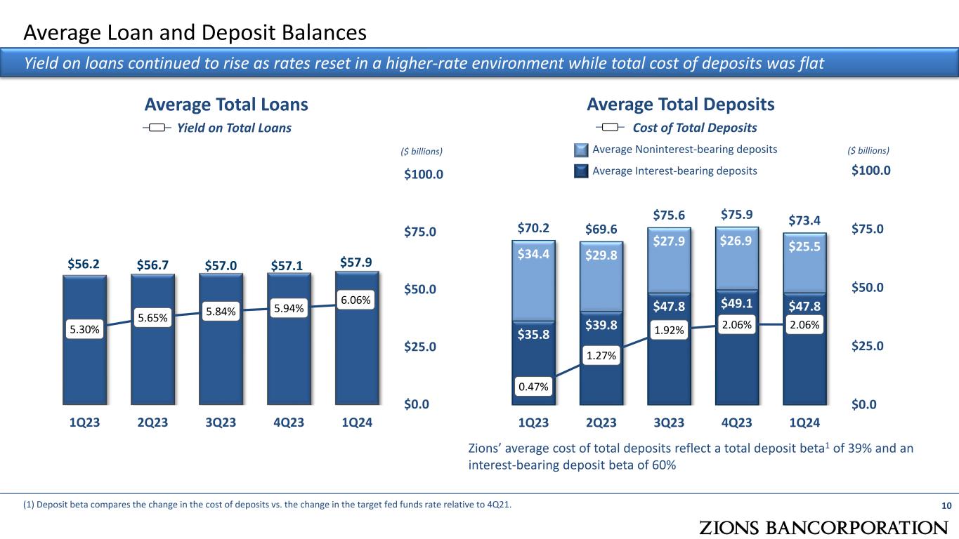 $5 12 $5 08 $4 96 $5 81 $5 26 $5 09 $4 94 $4 93 $4 89 $5 11 59.9% 62.5% 64.4% 65.1% 67.9% 1Q23 2Q23 3Q23 4Q23 1Q24 NIE (GAAP) Adjusted NIE (Non-GAAP) Efficiency Ratio ($ millions) Noninterest Expense 9 Adjusted noninterest expense increased linked quarter due to seasonal increases in compensation  Total noninterest expense decreased $55 million linked quarter and includes an additional $13 million of FDIC special assessment ($90 million accrued during 4Q23)  Adjusted noninterest expense increased $22 million linked quarter, mainly driven by seasonal increases in compensation  Adjusted noninterest expense was up 0.4% compared to prior year quarter, reflecting ongoing expense management efforts Notable items in:  1Q24: $13 million FDIC special assessment  1Q24: $12 million increase in share-based compensation  4Q23: $90 million FDIC special assessment  2Q23: $13 million severance expense  1Q23: $13 million increase in share-based compensation Noninterest Expense (NIE) (1) (1) Adjusted for items such as severance costs, restructuring costs, FDIC special assessment, and other real estate expense. See Appendix for non-GAAP financial measures. (1)