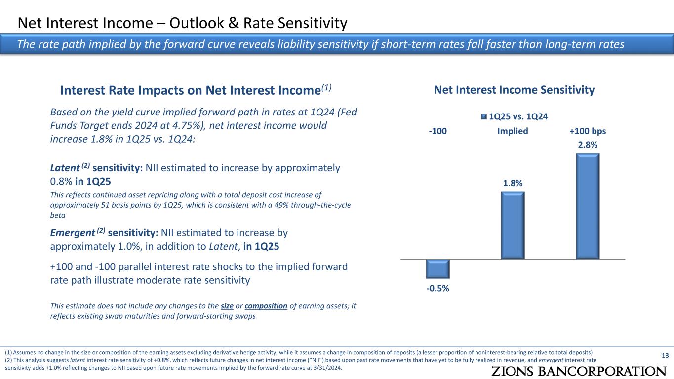 Securities & Money Market Investments 12 Total Securities Portfolio and Money Market Investments (period-end balances) $22.6 $21.6 $20.7 $20.7 $20.2 $3.4 $2.3 $3.1 $2.4 $2.6 1Q23 2Q23 3Q23 4Q23 1Q24 Total Securities Money Market Investments ($ billions) The bank has strong on-balance sheet liquidity The investment portfolio is designed to be a storehouse of balance sheet liquidity  Principal and prepayment-related cash flows from securities were $712 million for the quarter  The composition of the investment portfolio allows for deep on-balance sheet liquidity through the repo market  Approximately 90% of securities are U.S. Government and U.S. Government Agency/GSE securities 32% 30% 30% 29% 28%Percent of earning assets The investment portfolio is also used to balance interest rate risk  The estimated deposit duration at March 31, 2024 is assumed to be longer than the loan duration (including swaps); the investment portfolio brings balance to this mismatch  The estimated price sensitivity of the securities portfolio is 3.6 percent (including the impact of fair value hedges) compared to 4.1 percent in the prior year quarter