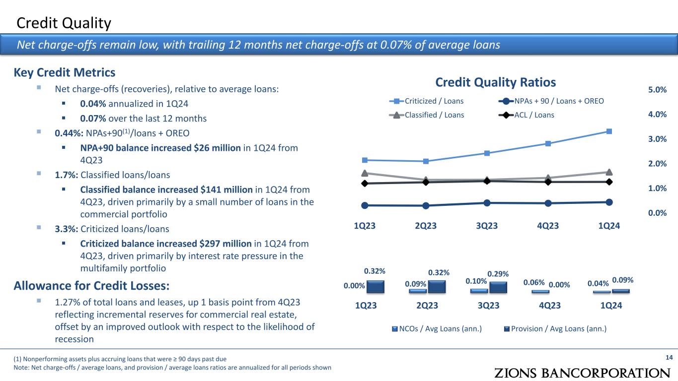 -0.5% 1.8% 2.8% -100 Implied +100 bps 1Q25 vs. 1Q24 Net Interest Income – Outlook & Rate Sensitivity 13 The rate path implied by the forward curve reveals liability sensitivity if short-term rates fall faster than long-term rates (1) Assumes no change in the size or composition of the earning assets excluding derivative hedge activity, while it assumes a change in composition of deposits (a lesser proportion of noninterest-bearing relative to total deposits) (2) This analysis suggests latent interest rate sensitivity of +0.8%, which reflects future changes in net interest income (“NII”) based upon past rate movements that have yet to be fully realized in revenue, and emergent interest rate sensitivity adds +1.0% reflecting changes to NII based upon future rate movements implied by the forward rate curve at 3/31/2024. Net Interest Income Sensitivity Based on the yield curve implied forward path in rates at 1Q24 (Fed Funds Target ends 2024 at 4.75%), net interest income would increase 1.8% in 1Q25 vs. 1Q24: Latent (2) sensitivity: NII estimated to increase by approximately 0.8% in 1Q25 This reflects continued asset repricing along with a total deposit cost increase of approximately 51 basis points by 1Q25, which is consistent with a 49% through-the-cycle beta Emergent (2) sensitivity: NII estimated to increase by approximately 1.0%, in addition to Latent, in 1Q25 +100 and -100 parallel interest rate shocks to the implied forward rate path illustrate moderate rate sensitivity This estimate does not include any changes to the size or composition of earning assets; it reflects existing swap maturities and forward-starting swaps Interest Rate Impacts on Net Interest Income(1)
