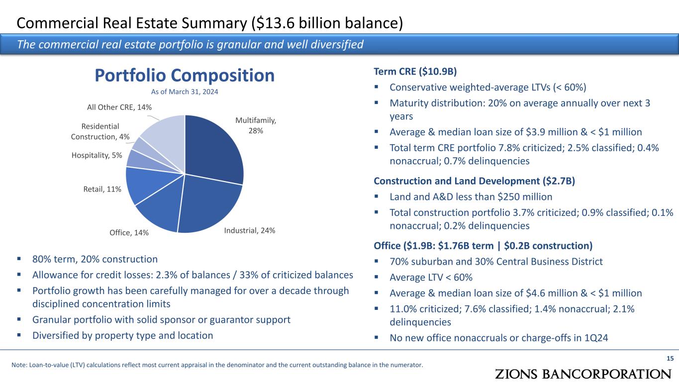 14 Credit Quality Ratios Net charge-offs remain low, with trailing 12 months net charge-offs at 0.07% of average loans Key Credit Metrics  Net charge-offs (recoveries), relative to average loans:  0.04% annualized in 1Q24  0.07% over the last 12 months  0.44%: NPAs+90(1)/loans + OREO  NPA+90 balance increased $26 million in 1Q24 from 4Q23  1.7%: Classified loans/loans  Classified balance increased $141 million in 1Q24 from 4Q23, driven primarily by a small number of loans in the commercial portfolio  3.3%: Criticized loans/loans  Criticized balance increased $297 million in 1Q24 from 4Q23, driven primarily by interest rate pressure in the multifamily portfolio Allowance for Credit Losses:  1.27% of total loans and leases, up 1 basis point from 4Q23 reflecting incremental reserves for commercial real estate, offset by an improved outlook with respect to the likelihood of recession (1) Nonperforming assets plus accruing loans that were ≥ 90 days past due Note: Net charge-offs / average loans, and provision / average loans ratios are annualized for all periods shown Credit Quality 0.00% 0.09% 0.10% 0.06% 0.04% 0.32% 0.32% 0.29% 0.00% 0.09% 1Q23 2Q23 3Q23 4Q23 1Q24 NCOs / Avg Loans (ann.) Provision / Avg Loans (ann.) 0.0% 1.0% 2.0% 3.0% 4.0% 5.0% 1Q23 2Q23 3Q23 4Q23 1Q24 Criticized / Loans NPAs + 90 / Loans + OREO Classified / Loans ACL / Loans