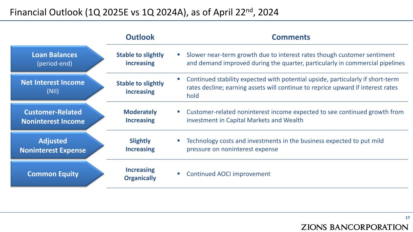 Net Charge-offs annualized, as a percentage of risk-weighted assets (0 .0 1% ) (0 .0 1% ) 0. 01 % 0. 04 % 0. 06 % 0. 16 % (0 .0 2% ) 0. 00 % 0. 08 % 0. 08 % 0. 05 % 0. 04 % (4%) (2%) 0% 2% 4% 6% 8% 10% 12% 14% 2Q 21 3Q 21 4Q 21 1Q 22 2Q 22 3Q 22 4Q 22 1Q 23 2Q 23 3Q 23 4Q 23 1Q 24 Capital Strength 16 Loss-absorbing capital remains strong relative to our risk profile; low credit losses relative to CET1 + ACL Common Equity Tier 1 Capital and Allowance for Credit Losses as a percentage of risk-weighted assets 11 .3 % 10 .9 % 10 .2 % 10 .0 % 9. 9% 9. 6% 9. 8% 9. 9% 10 .0 % 10 .2 % 10 .3 % 10 .4 % 12 .3 % 11 .8 % 11 .1 % 10 .9 % 10 .7 % 10 .5 % 10 .7 % 11 .0 % 11 .1 % 11 .3 % 11 .3 % 11 .5 % 0% 2% 4% 6% 8% 10% 12% 14% 2Q 21 3Q 21 4Q 21 1Q 22 2Q 22 3Q 22 4Q 22 1Q 23 2Q 23 3Q 23 4Q 23 1Q 24 Common Equity Tier 1 ACL / Risk-weighted Assets