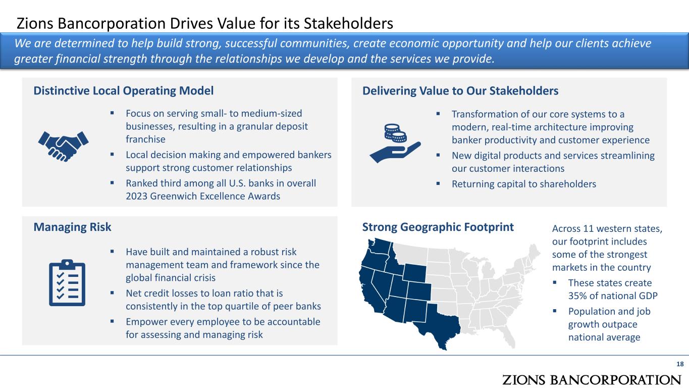 Financial Outlook (1Q 2025E vs 1Q 2024A), as of April 22nd, 2024 17 Outlook Comments Stable to slightly increasing  Slower near-term growth due to interest rates though customer sentiment and demand improved during the quarter, particularly in commercial pipelines Stable to slightly increasing  Continued stability expected with potential upside, particularly if short-term rates decline; earning assets will continue to reprice upward if interest rates hold Moderately Increasing  Customer-related noninterest income expected to see continued growth from investment in Capital Markets and Wealth Slightly Increasing  Technology costs and investments in the business expected to put mild pressure on noninterest expense Increasing Organically  Continued AOCI improvement Customer-Related Noninterest Income Loan Balances (period-end) Net Interest Income (NII) Common Equity Adjusted Noninterest Expense