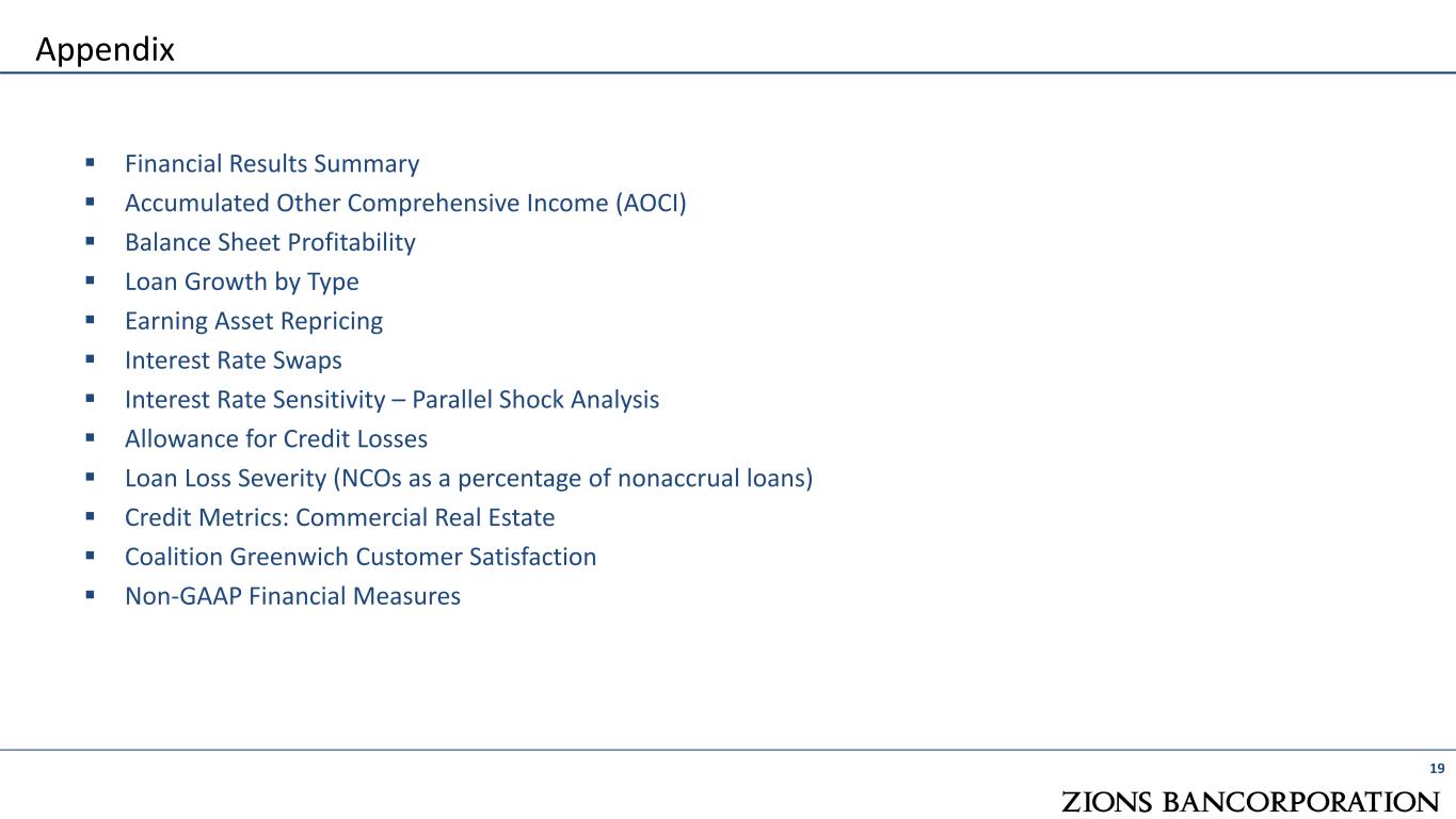 Zions Bancorporation Drives Value for its Stakeholders 18 We are determined to help build strong, successful communities, create economic opportunity and help our clients achieve greater financial strength through the relationships we develop and the services we provide. Distinctive Local Operating Model Managing Risk Delivering Value to Our Stakeholders  Transformation of our core systems to a modern, real-time architecture improving banker productivity and customer experience  New digital products and services streamlining our customer interactions  Returning capital to shareholders  Focus on serving small- to medium-sized businesses, resulting in a granular deposit franchise  Local decision making and empowered bankers support strong customer relationships  Ranked third among all U.S. banks in overall 2023 Greenwich Excellence Awards  Have built and maintained a robust risk management team and framework since the global financial crisis  Net credit losses to loan ratio that is consistently in the top quartile of peer banks  Empower every employee to be accountable for assessing and managing risk Across 11 western states, our footprint includes some of the strongest markets in the country  These states create 35% of national GDP  Population and job growth outpace national average Strong Geographic Footprint