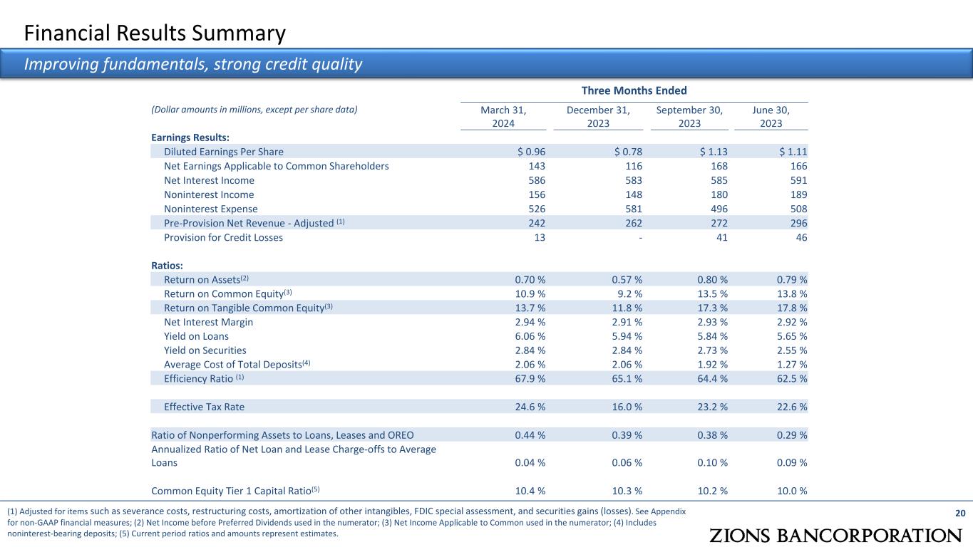  Financial Results Summary  Accumulated Other Comprehensive Income (AOCI)  Balance Sheet Profitability  Loan Growth by Type  Earning Asset Repricing  Interest Rate Swaps  Interest Rate Sensitivity – Parallel Shock Analysis  Allowance for Credit Losses  Loan Loss Severity (NCOs as a percentage of nonaccrual loans)  Credit Metrics: Commercial Real Estate  Coalition Greenwich Customer Satisfaction  Non-GAAP Financial Measures 19 Appendix