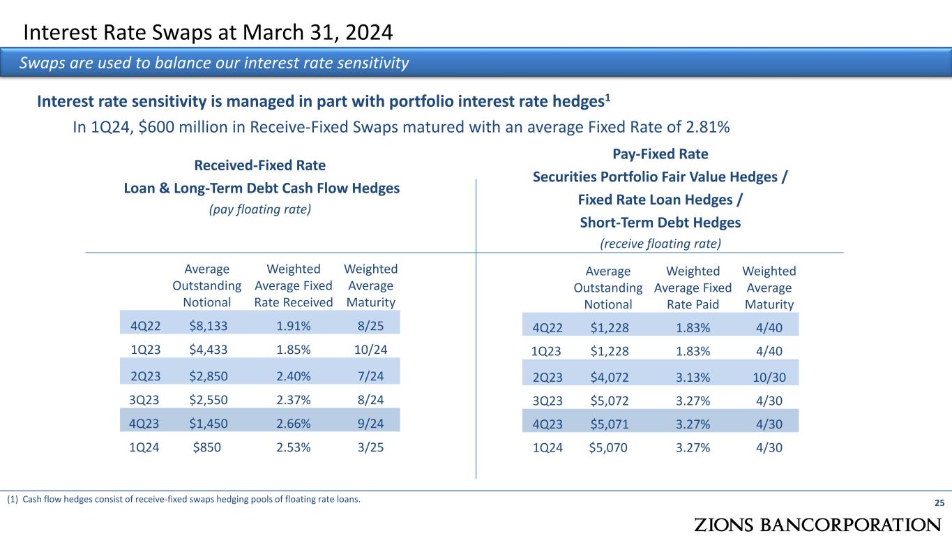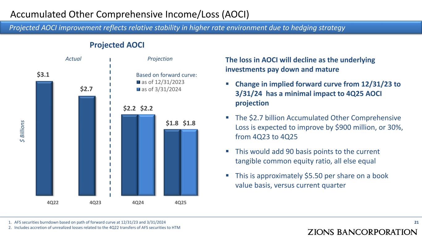 Accumulated Other Comprehensive Income/Loss (AOCI) Projected AOCI improvement reflects relative stability in higher rate environment due to hedging strategy $ Bi lli on s Projected AOCI 211. AFS securities burndown based on path of forward curve at 12/31/23 and 3/31/2024 2. Includes accretion of unrealized losses related to the 4Q22 transfers of AFS securities to HTM The loss in AOCI will decline as the underlying investments pay down and mature  Change in implied forward curve from 12/31/23 to 3/31/24 has a minimal impact to 4Q25 AOCI projection  The $2.7 billion Accumulated Other Comprehensive Loss is expected to improve by $900 million, or 30%, from 4Q23 to 4Q25  This would add 90 basis points to the current tangible common equity ratio, all else equal  This is approximately $5.50 per share on a book value basis, versus current quarter $3.1 $2.7 $2.2 $1.8 $2.2 $1.8 4Q22 4Q23 4Q24 4Q25 as of 12/31/2023 as of 3/31/2024 Actual Projection Based on forward curve:
