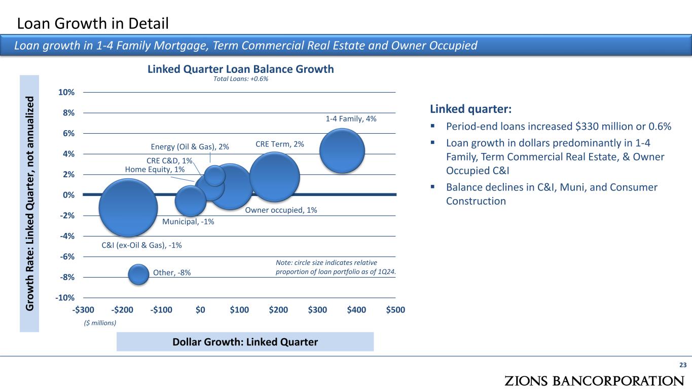 Loan Growth in Detail Loan growth in 1-4 Family Mortgage, Term Commercial Real Estate and Owner Occupied Linked Quarter Loan Balance Growth Total Loans: +0.6% Linked quarter:  Period-end loans increased $330 million or 0.6%  Loan growth in dollars predominantly in 1-4 Family, Term Commercial Real Estate, & Owner Occupied C&I  Balance declines in C&I, Muni, and Consumer Construction G ro w th R at e: L in ke d Q ua rt er , n ot a nn ua liz ed Dollar Growth: Linked Quarter 23 C&I (ex-Oil & Gas), -1% Owner occupied, 1% CRE C&D, 1% CRE Term, 2% Home Equity, 1% 1-4 Family, 4% Energy (Oil & Gas), 2% Municipal, -1% Other, -8% -10% -8% -6% -4% -2% 0% 2% 4% 6% 8% 10% -$300 -$200 -$100 $0 $100 $200 $300 $400 $500 Note: circle size indicates relative proportion of loan portfolio as of 1Q24. ($ millions)