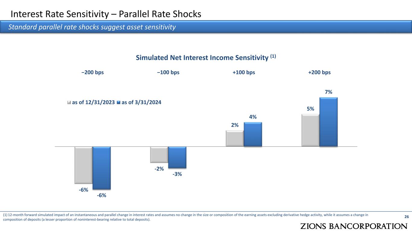 25 Interest Rate Swaps at March 31, 2024 Swaps are used to balance our interest rate sensitivity Average Outstanding Notional Weighted Average Fixed Rate Received Weighted Average Maturity 4Q22 $8,133 1.91% 8/25 1Q23 $4,433 1.85% 10/24 2Q23 $2,850 2.40% 7/24 3Q23 $2,550 2.37% 8/24 4Q23 $1,450 2.66% 9/24 1Q24 $850 2.53% 3/25 Received-Fixed Rate Loan & Long-Term Debt Cash Flow Hedges (pay floating rate) Average Outstanding Notional Weighted Average Fixed Rate Paid Weighted Average Maturity 4Q22 $1,228 1.83% 4/40 1Q23 $1,228 1.83% 4/40 2Q23 $4,072 3.13% 10/30 3Q23 $5,072 3.27% 4/30 4Q23 $5,071 3.27% 4/30 1Q24 $5,070 3.27% 4/30 Pay-Fixed Rate Securities Portfolio Fair Value Hedges / Fixed Rate Loan Hedges / Short-Term Debt Hedges (receive floating rate) (1) Cash flow hedges consist of receive-fixed swaps hedging pools of floating rate loans. Interest rate sensitivity is managed in part with portfolio interest rate hedges1 In 1Q24, $600 million in Receive-Fixed Swaps matured with an average Fixed Rate of 2.81%