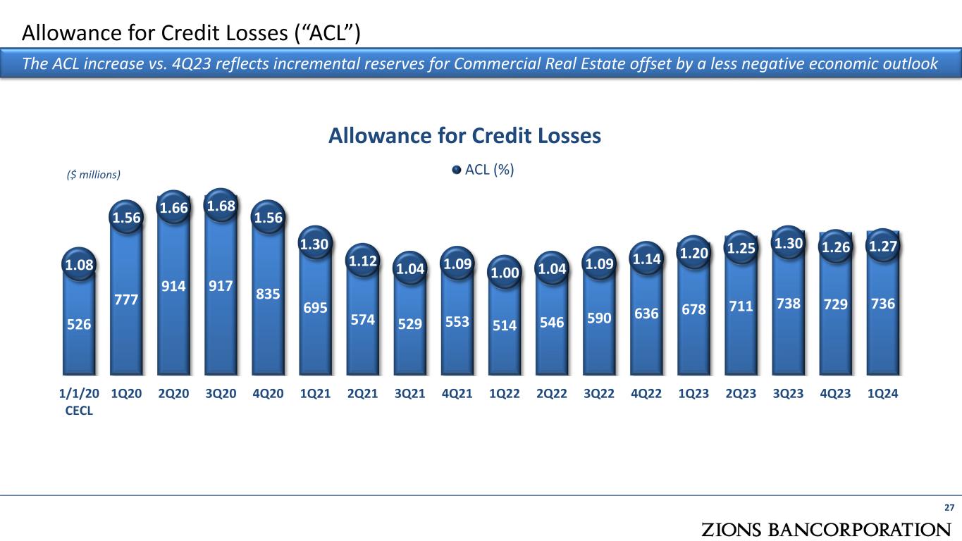 526 777 914 917 835 695 574 529 553 514 546 590 636 678 711 738 729 736 1.08 1.56 1.66 1.68 1.56 1.30 1.12 1.04 1.09 1.00 1.04 1.09 1.14 1.20 1.25 1.30 1.26 1.27 1/1/20 CECL 1Q20 2Q20 3Q20 4Q20 1Q21 2Q21 3Q21 4Q21 1Q22 2Q22 3Q22 4Q22 1Q23 2Q23 3Q23 4Q23 1Q24 Allowance for Credit Losses ACL (%) 27 Allowance for Credit Losses (“ACL”) The ACL increase vs. 4Q23 reflects incremental reserves for Commercial Real Estate offset by a less negative economic outlook ($ millions)