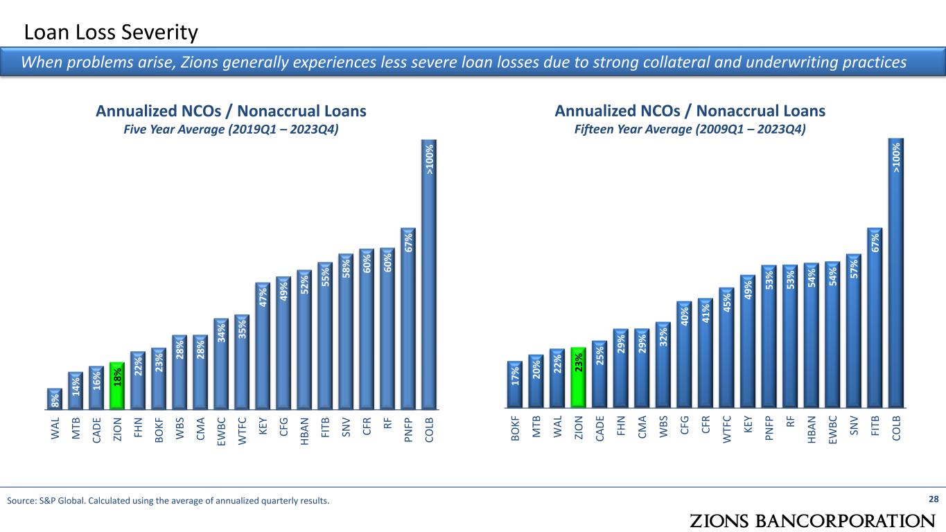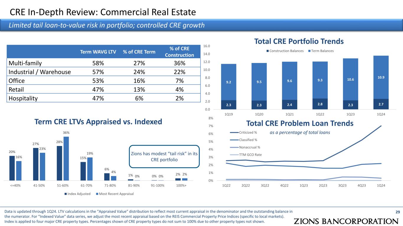 8% 14 % 16 % 18 % 22 % 23 % 28 % 28 % 34 % 35 % 47 % 49 % 52 % 55 % 58 % 60 % 60 % 67 % W AL M TB CA DE ZI O N FH N BO KF W BS CM A EW BC W TF C KE Y CF G HB AN FI TB SN V CF R RF PN FP CO LB Loan Loss Severity Annualized NCOs / Nonaccrual Loans Five Year Average (2019Q1 – 2023Q4) Annualized NCOs / Nonaccrual Loans Fifteen Year Average (2009Q1 – 2023Q4) 28Source: S&P Global. Calculated using the average of annualized quarterly results. When problems arise, Zions generally experiences less severe loan losses due to strong collateral and underwriting practices 17 % 20 % 22 % 23 % 25 % 29 % 29 % 32 % 40 % 41 % 45 % 49 % 53 % 53 % 54 % 54 % 57 % 67 % BO KF M TB W AL ZI O N CA DE FH N CM A W BS CF G CF R W TF C KE Y PN FP RF HB AN EW BC SN V FI TB CO LB >1 00 % >1 00 %