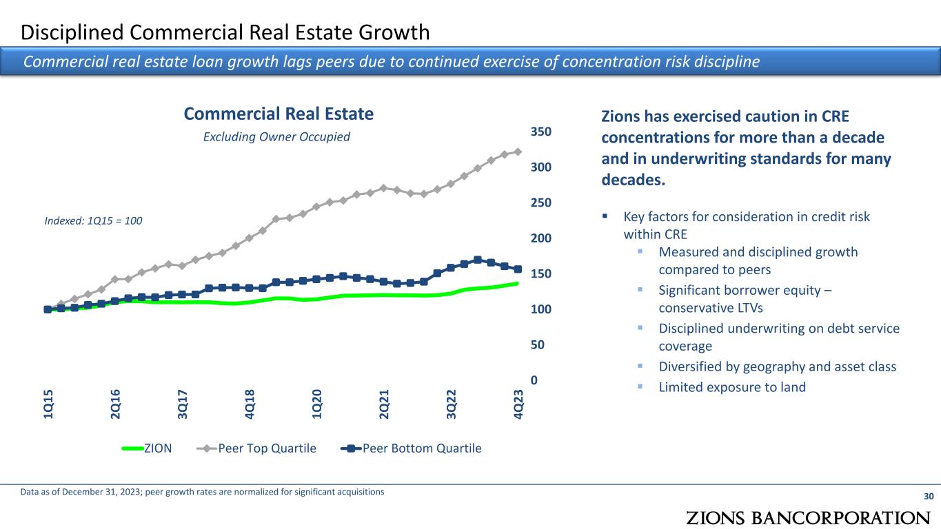 CRE In-Depth Review: Commercial Real Estate 29 Limited tail loan-to-value risk in portfolio; controlled CRE growth Data is updated through 1Q24. LTV calculations in the “Appraised Value” distribution to reflect most current appraisal in the denominator and the outstanding balance in the numerator. For “Indexed Value” data series, we adjust the most recent appraisal based on the REIS Commercial Property Price Indices (specific to local markets). Index is applied to four major CRE property types. Percentages shown of CRE property types do not sum to 100% due to other property types not shown. Zions has modest “tail risk” in its CRE portfolio Term WAVG LTV % of CRE Term % of CRE Construction Multi-family 58% 27% 36% Industrial / Warehouse 57% 24% 22% Office 53% 16% 7% Retail 47% 13% 4% Hospitality 47% 6% 2% Total CRE Portfolio Trends Total CRE Problem Loan Trends as a percentage of total loans 20% 27% 28% 15% 6% 1% 0% 2% 16% 23% 36% 19% 4% 0% 0% 2% <=40% 41-50% 51-60% 61-70% 71-80% 81-90% 91-100% 100%+ Term CRE LTVs Appraised vs. Indexed Index Adjusted Most Recent Appraisal 0% 1% 2% 3% 4% 5% 6% 7% 8% 1Q22 2Q22 3Q22 4Q22 1Q23 2Q23 3Q23 4Q23 1Q24 Criticized % Classified % Nonaccrual % TTM GCO Rate 2.3 2.3 2.4 2.8 2.3 2.7 9.2 9.5 9.6 9.3 10.6 10.9 0.0 2.0 4.0 6.0 8.0 10.0 12.0 14.0 16.0 1Q19 1Q20 1Q21 1Q22 1Q23 1Q24 Construction Balances Term Balances